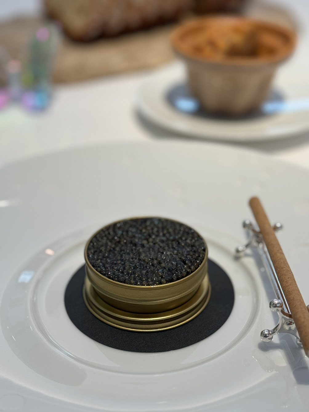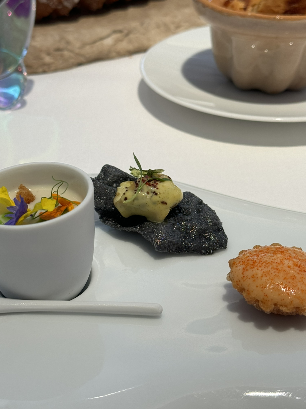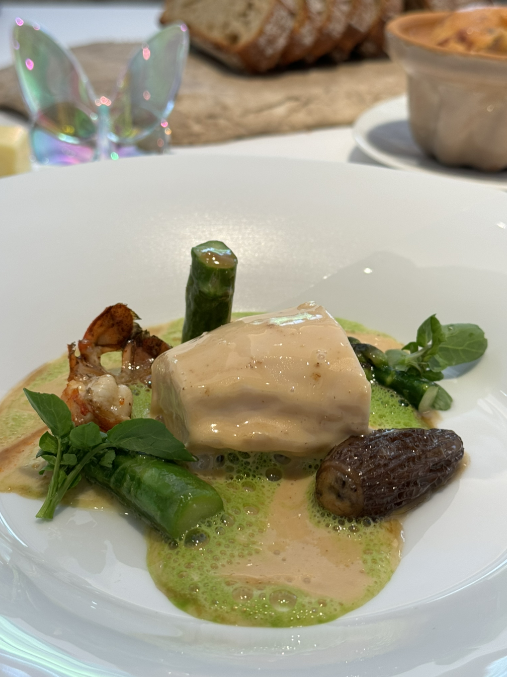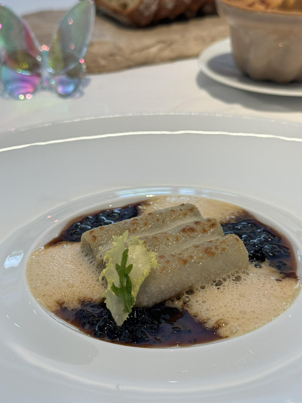 캐비어와 훈연한 감자 무스, 홀렌다이즈 소스로 구성된 요리는 그야말로 환상적인 조합이었습니다. 짭조름한 캐비어와 부드러운 감자 무스, 훈연의 킥이 어우러진 이 요리는 산도가 높은 상세르 와인과 완벽한 페어링을 이루었습니다.