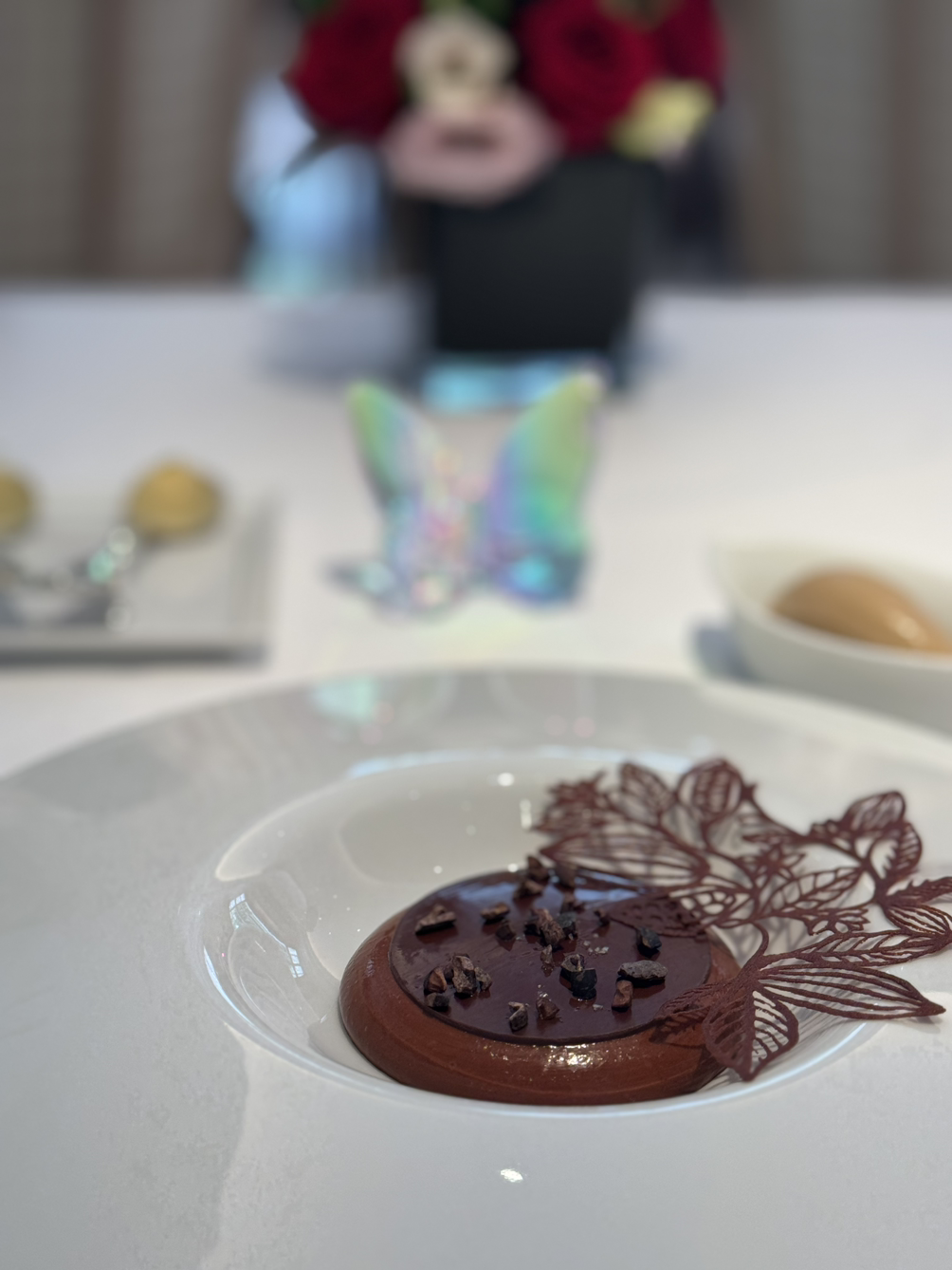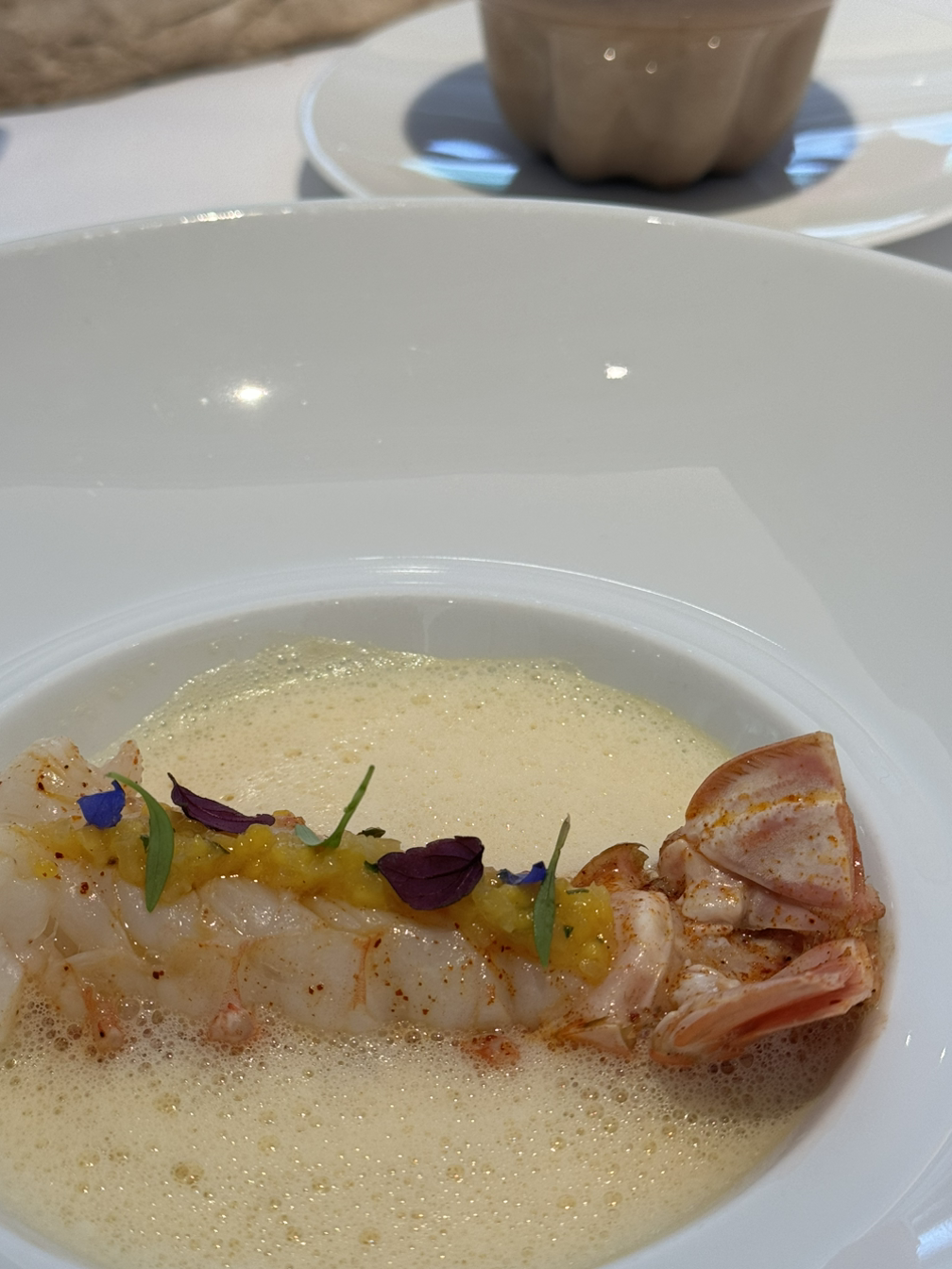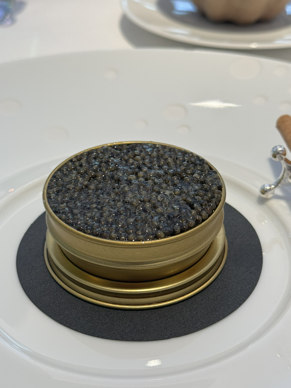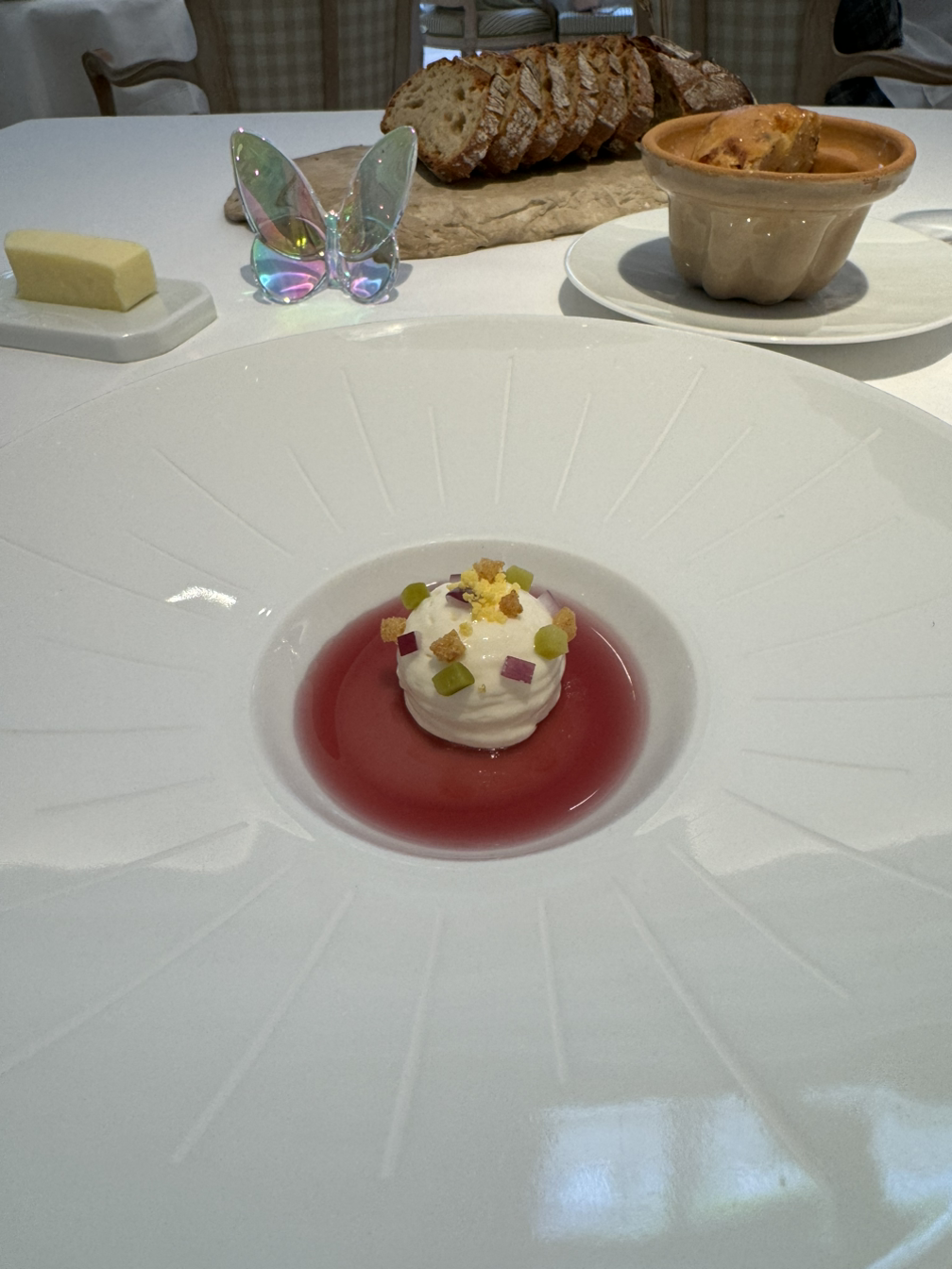 캐비어와 훈연한 감자 무스, 홀렌다이즈 소스로 구성된 요리는 그야말로 환상적인 조합이었습니다. 짭조름한 캐비어와 부드러운 감자 무스, 훈연의 킥이 어우러진 이 요리는 산도가 높은 상세르 와인과 완벽한 페어링을 이루었습니다.