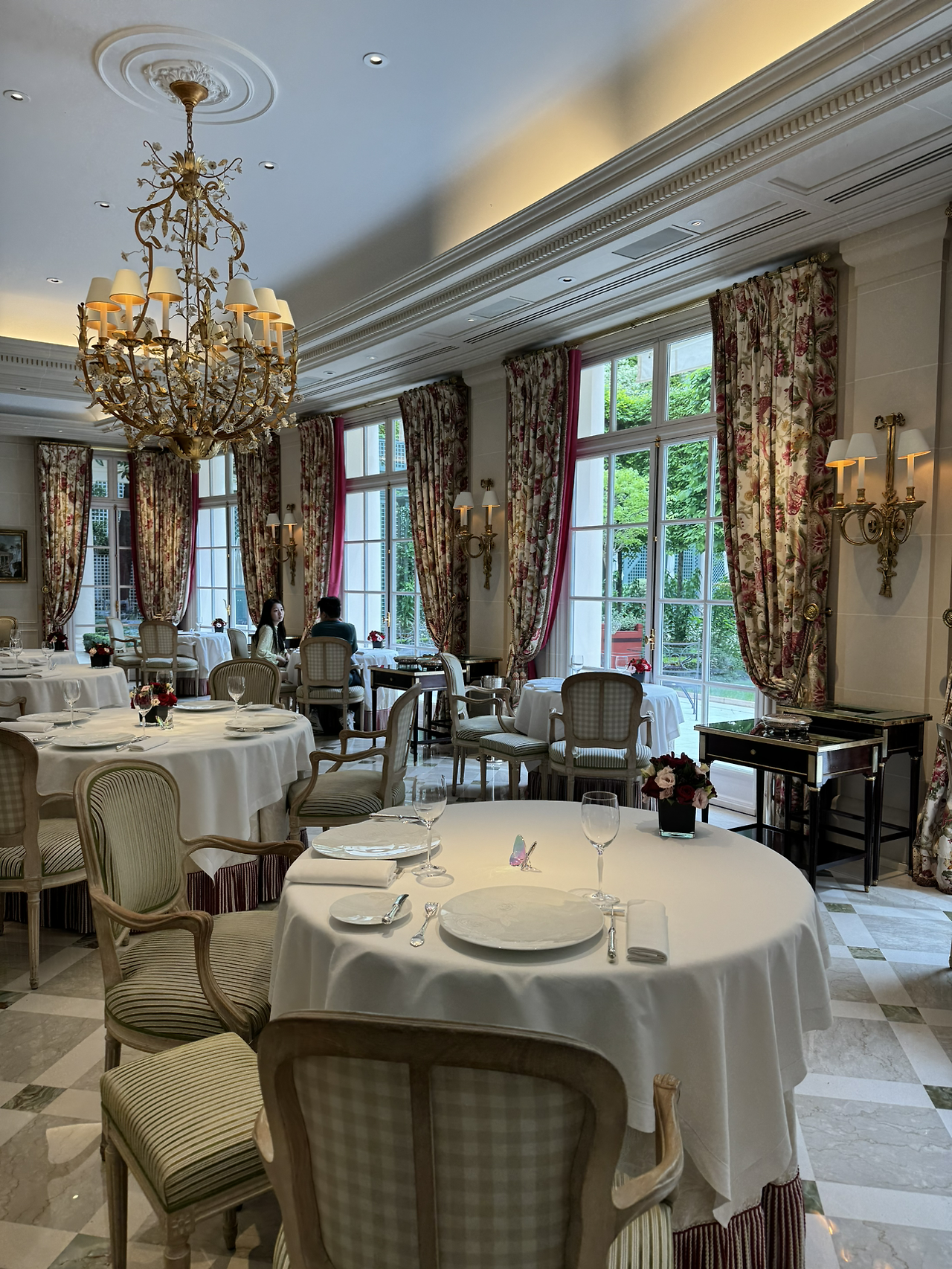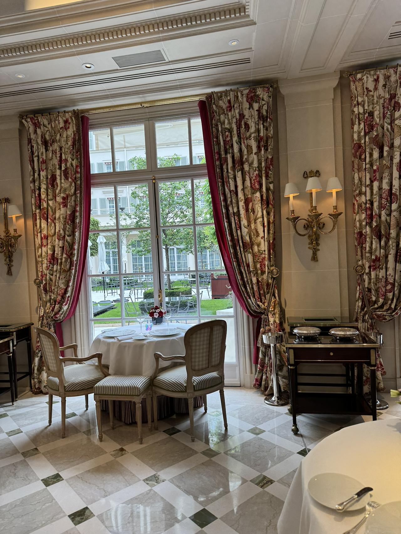 레스토랑 내부는 핑크색 커튼과 쿠션 장식으로 꾸며져 있으며, 이는 화려하면서도 차분한 인상을 줍니다. 햇살과 샹들리에 불빛이 어우러져 공간 전체를 환하게 밝히며, 정원을 바라보며 식사를 즐길 수 있는 이상적인 환경을 제공합니다.