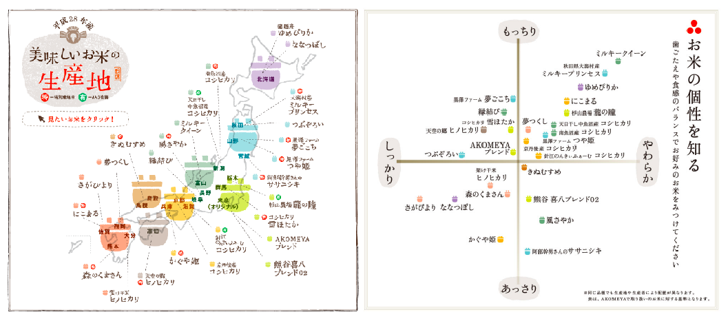 종류가 많다고 바람직한 건 아닙니다. 쌀에 조예가 깊은 고객이 아니라면 여러 종류의 쌀을 보며 선택장애에 빠질 수 있습니다. 그래서 아코메야에서는 쌀을 추천해줍니다. 스시, 솥밥 등 어떤 밥을 지을 건지에 따라 적합한 쌀을 골라주고, 새롭게 판매를 하는 쌀 또는 햅쌀의 정보를 안내합니다. 출산 축하를 위해 신생아 체중과 같은 무게의 쌀을 선물해보라는 제안을 하기도 합니다. 쌀 추천을 통해 고객의 기호와 상황에 맞는 쌀을 고를 수 있도록 돕는 것입니다.