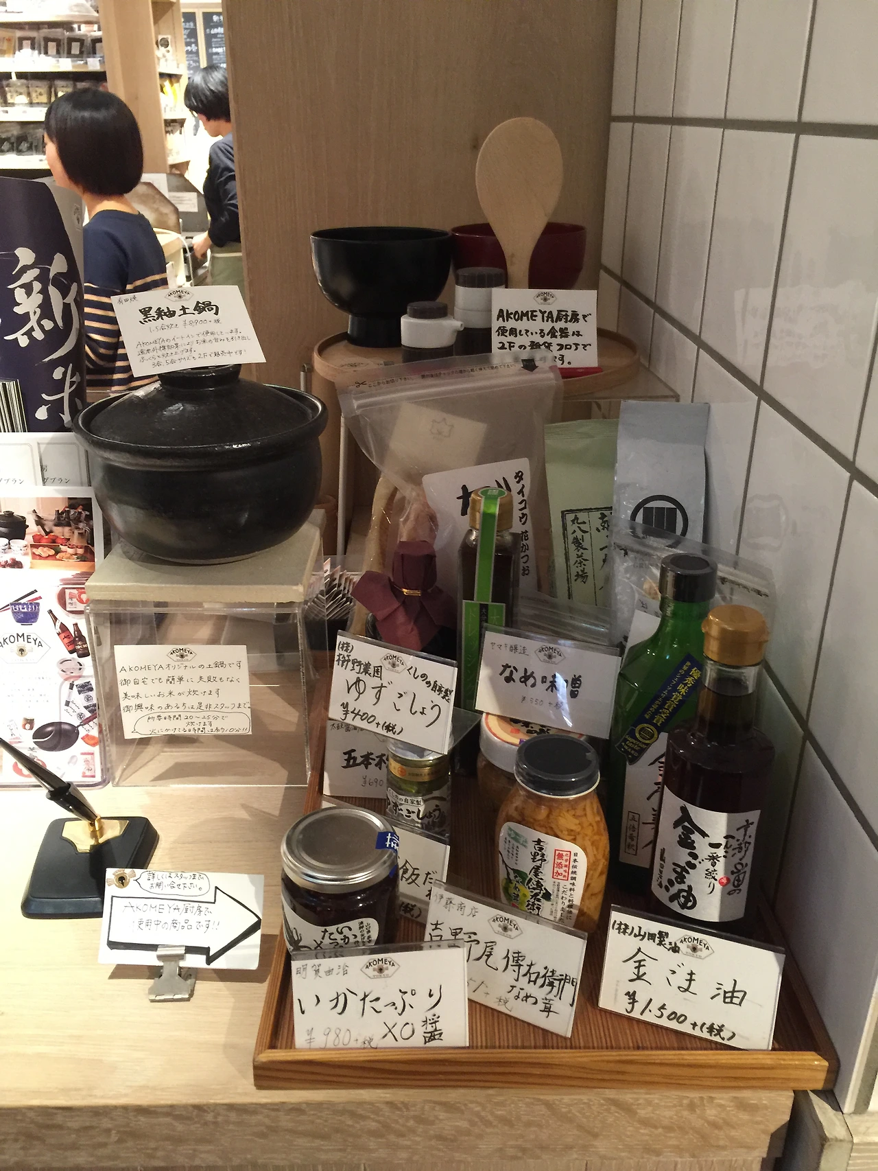 아코메야는 다이닝 라이프스타일을 제안하기 때문에 먹는 것만 판매하는 것이 아닙니다. 조리 기구, 주방 용품 등도 판매를 합니다. 세워서 보관하는 주걱 등 아이디어 제품부터 솥, 그릇, 젓가락, 이쑤시개 등 장인들이 제작한 전통 도구까지 주방의 가치를 높여주는 제품들을 제안합니다. 매장을 둘러보면 '품질이 탁월하거나, 일상에 풍요를 더하거나, 개성이 있는 상품들을 판매한다'는 아코메야의 제품 선정 기준에 공감할 수 있습니다. 또한 음식과 식문화 관련 책들도 함께 판매해 다이닝 라이프스타일에 깊이를 더할 수 있는 기회를 제공합니다.