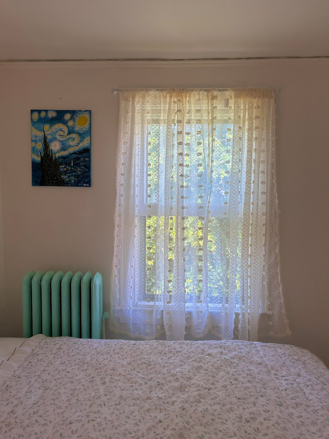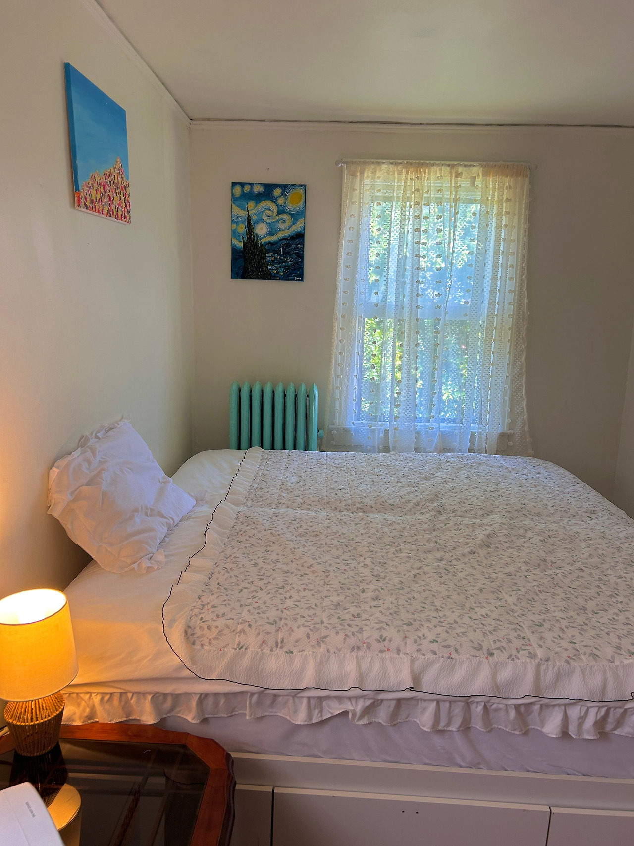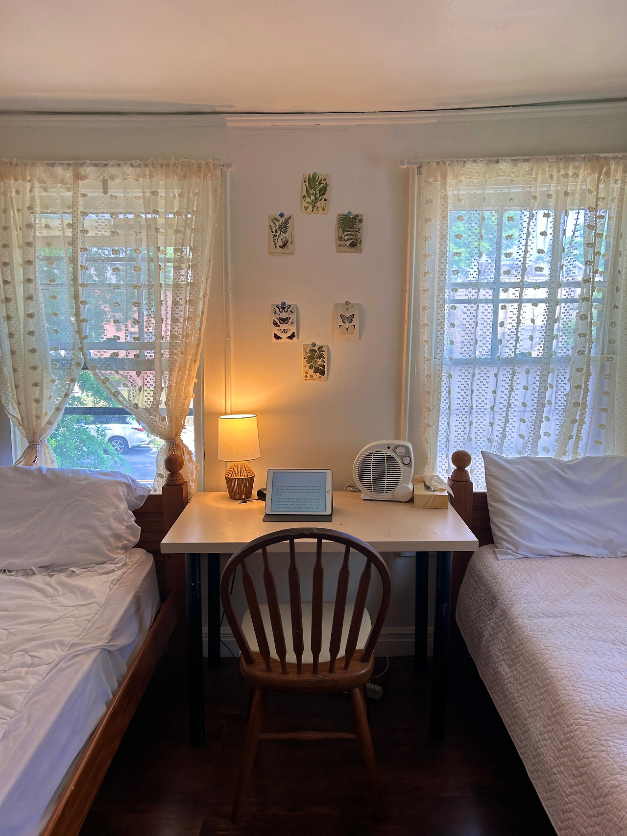 싱글침대 두개를 합쳐놓아서 굴러다니며 자도 될만큼 편하다. 창문밖은 조용한 뒷마당뷰. 나무들이 많이 자라 자연스레 옆집을 차단해 주는 역할을 해준다.