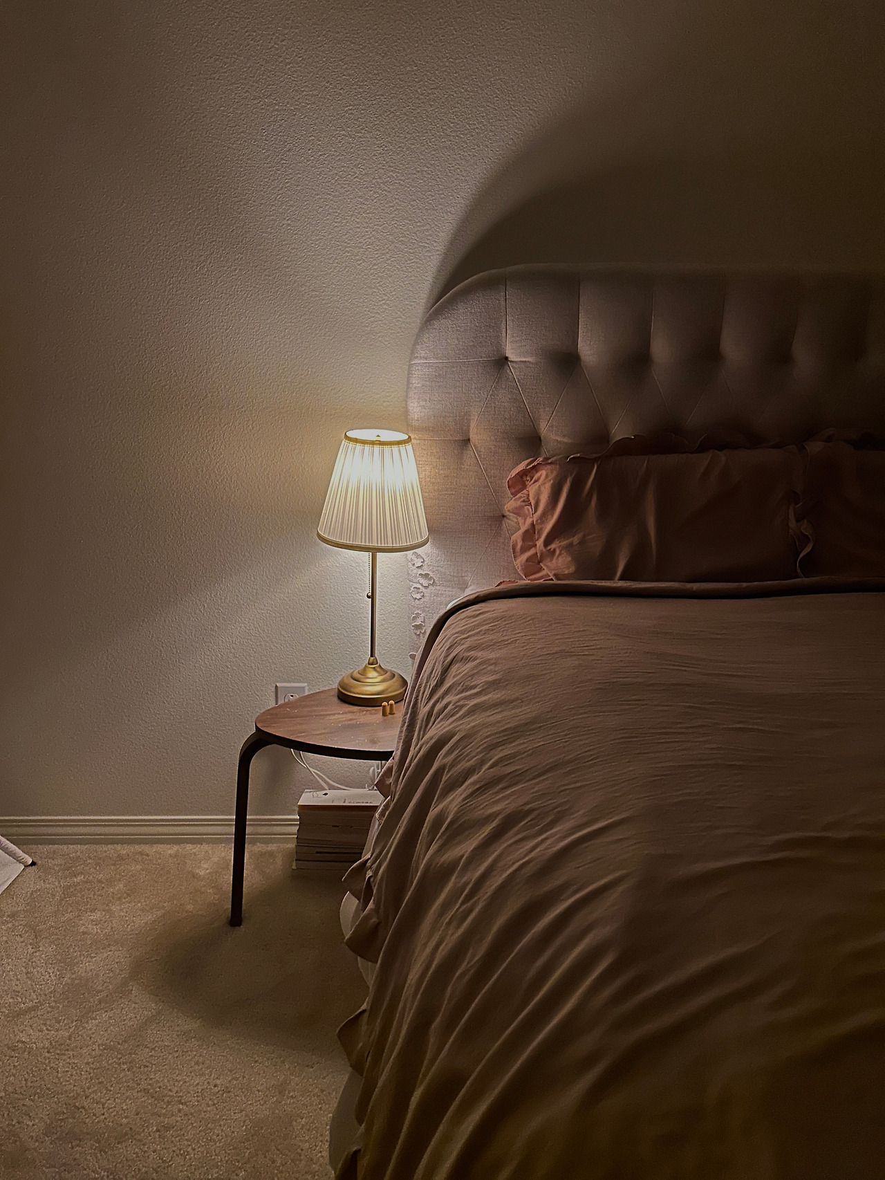 어두워진 침실로 와서 침대옆 스탠드를 켠다.