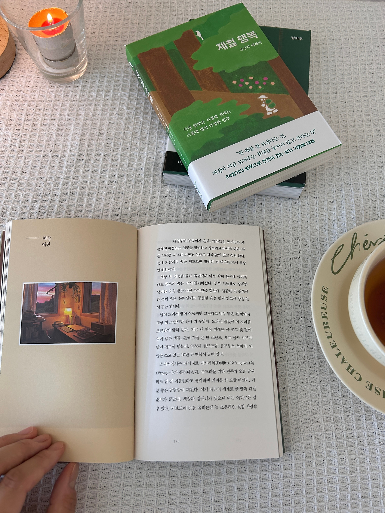 아직 안 읽어보았지만 얼핏 둘러본 내용은 작가의 따뜻한 시선으로 24 절기 각각의 행복을 제철 음식 맛보는 듯한 기쁨으로 써나간 내용이었다.