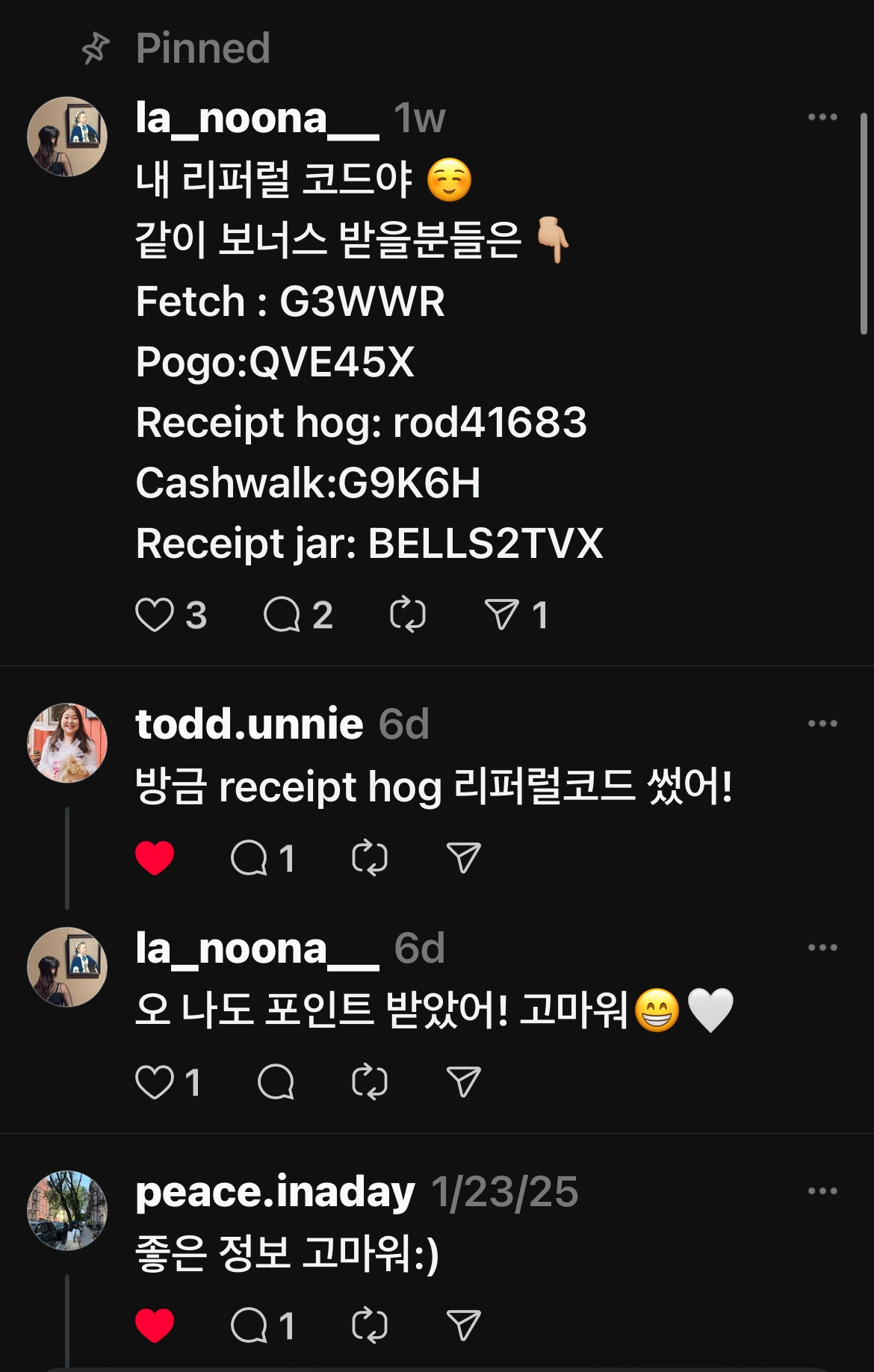 설문조사 앱도 해봤는데 시간과 노력이 꽤 많이 들었어서 너무 부담되지 않는 영수증앱과 걷기 앱이 나에겐 잘 맞는 듯하다는 의견과 함께 내 리퍼럴 코드를 적어놓았다. 앱을 가입하며 리퍼럴 코드를 넣으면 본인뿐 아니라 나도 같이 포인트 점수를 받을 수 있다.