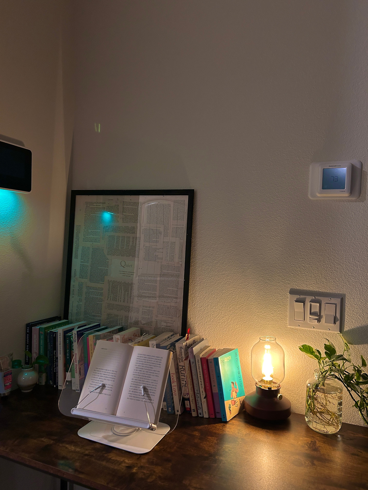 그러다 아이디어가 떠올라 200달러인 책장을 취소하고 집에 있는 책상을 가져와서 책들을 진열해 주고 기존에 쓰고 있던 이케아 램프를 놓아주었다. 그 옆으론 쑥쑥 잘 자라고 있는 식물을 몇 가지 솎아 물꽂이해서 놓아주었다. 책과 벽사이엔 영어원서 페이지들을 콜라주처럼 붙여 만들어준 액자를 놓아주었다.
