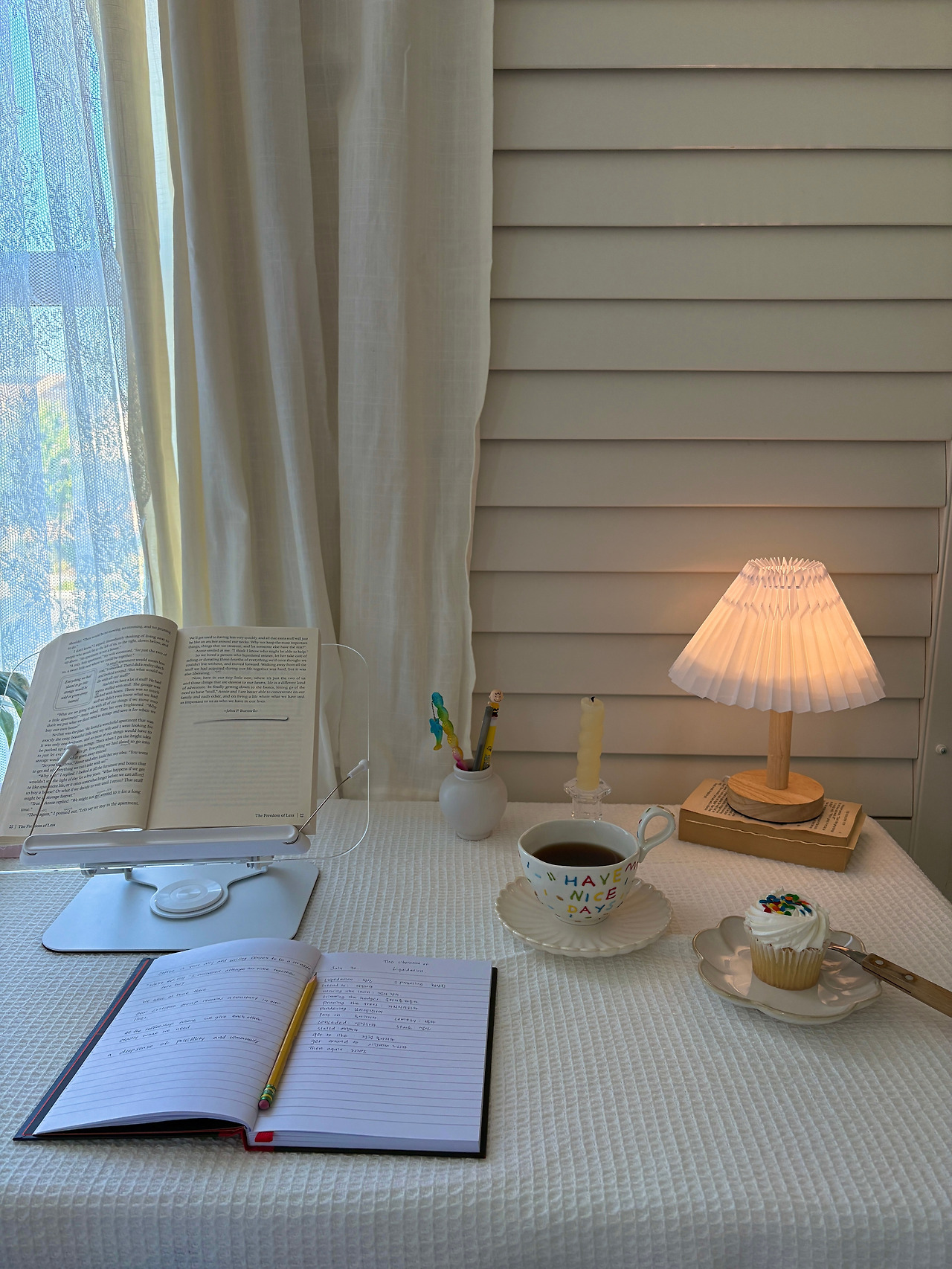 오후에 이 자리에 앉아 한 챕터의 영어 에세이를 읽고, 모르는 단어들과 마음에 남는 문장 10개를 노트에 기록한 후 외우고 스스로 시험을 본다.