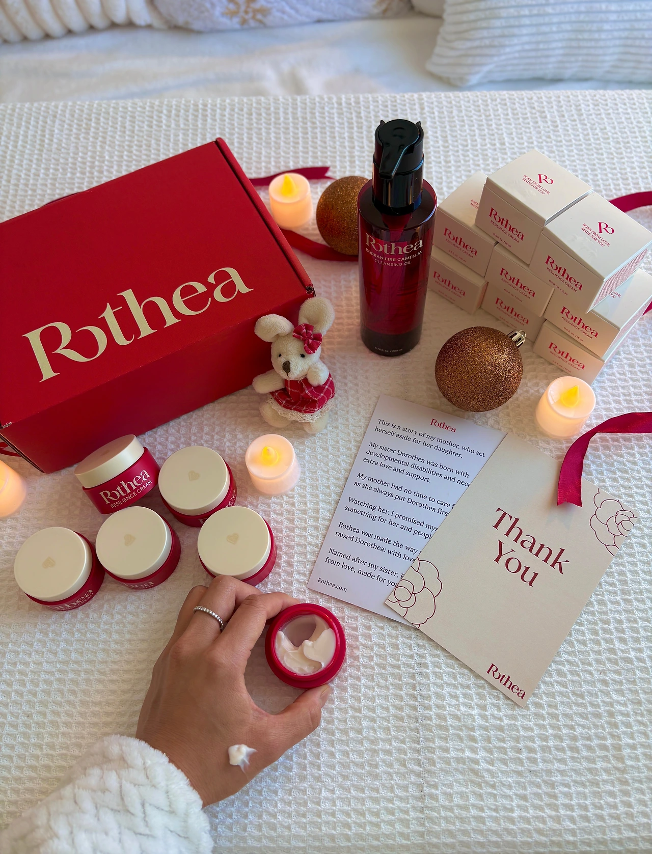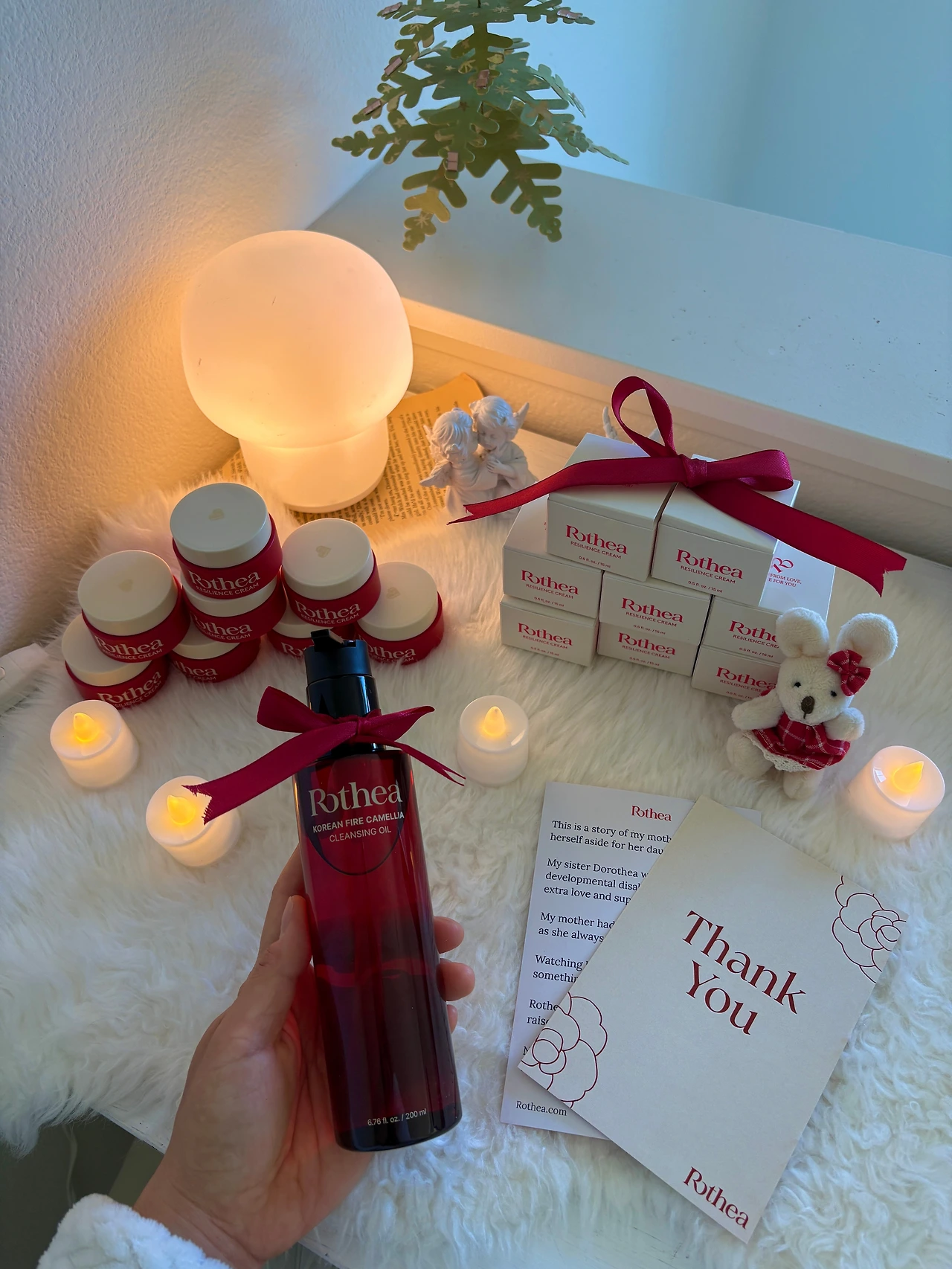 그리고 며칠 후, 설레는 동백색 상자가 도착했다. 마치 크리스마스 선물처럼 빨간 상자에 재생 크림들과 동백 오일 클렌저가 차곡차곡 담겨 있었다. 담당자님의 따뜻한 손글씨 카드와 함께, 회사가 만들어진 배경이 담긴 이야기도 들어 있었다.