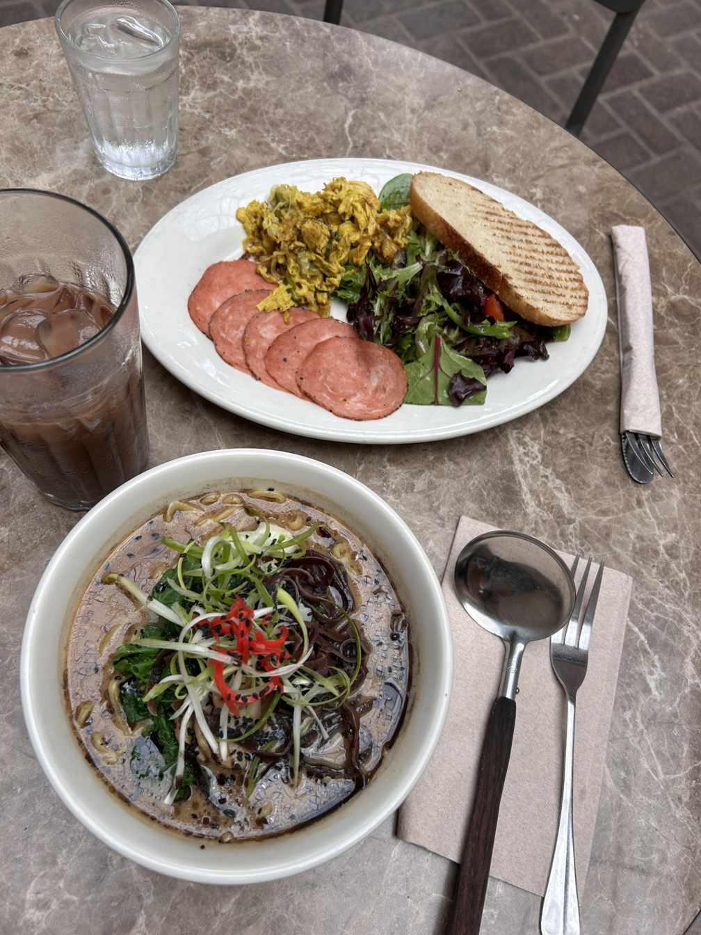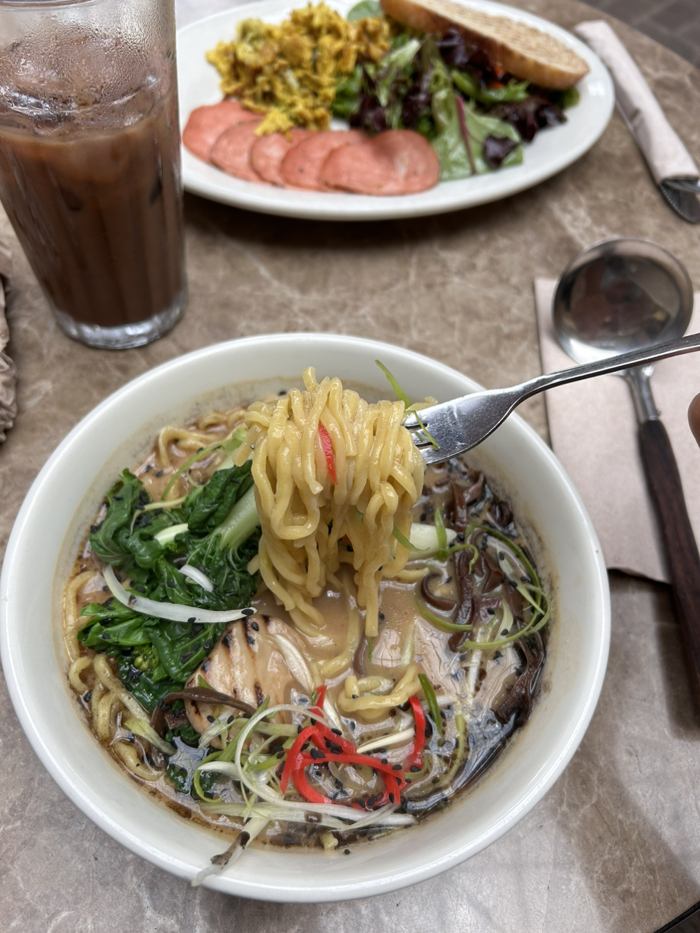 남편은 ham and eggs를 , 난 미소라멘을 시켰다.