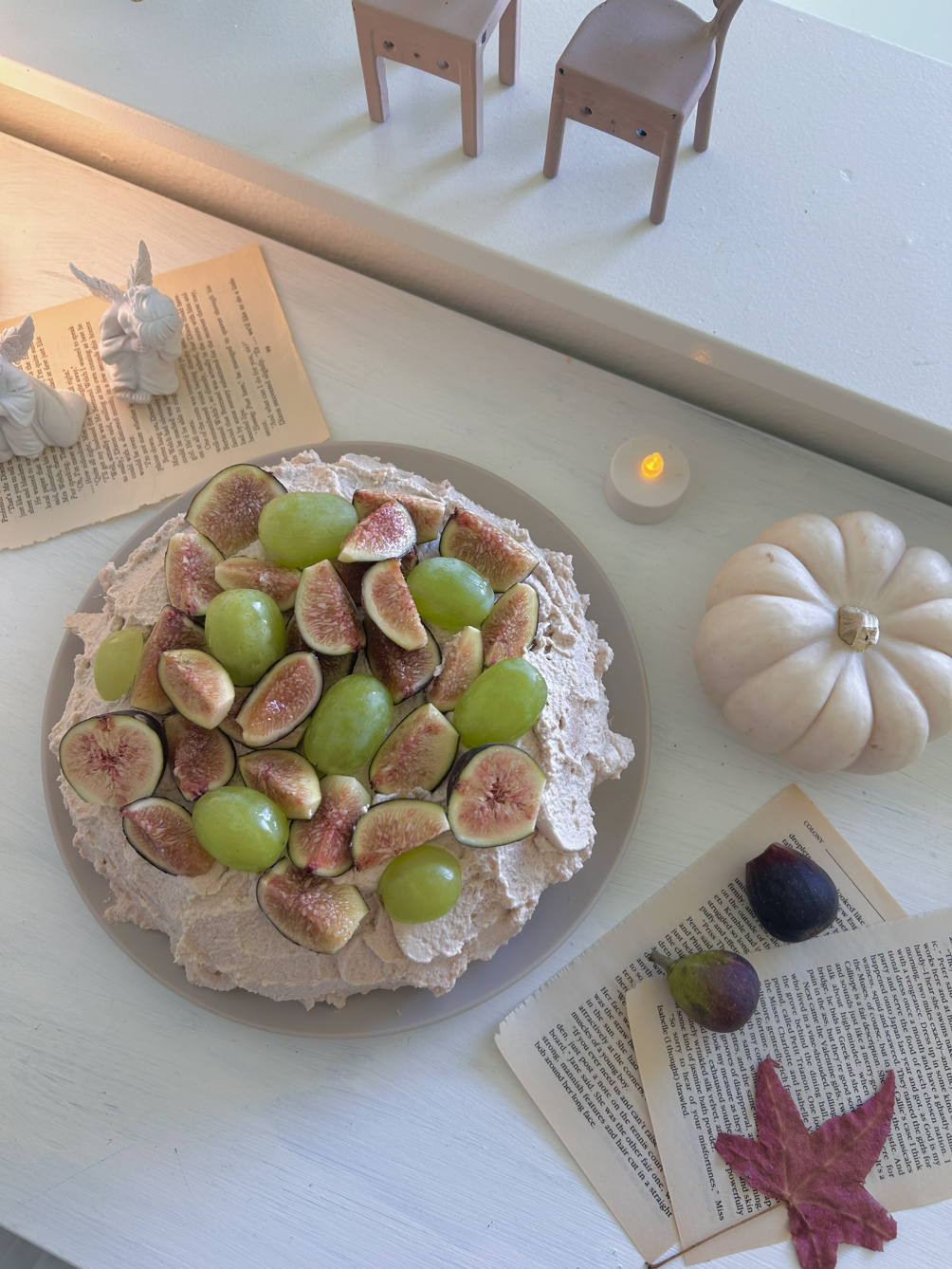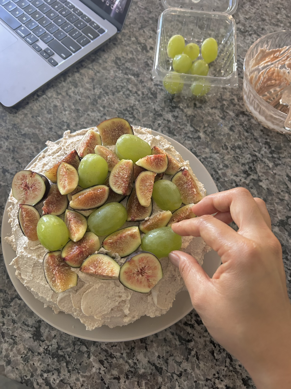 크림을 바른 빵 위에 4 등분한 무화과와 집에 있던 포도를 번갈아 올려주었다.