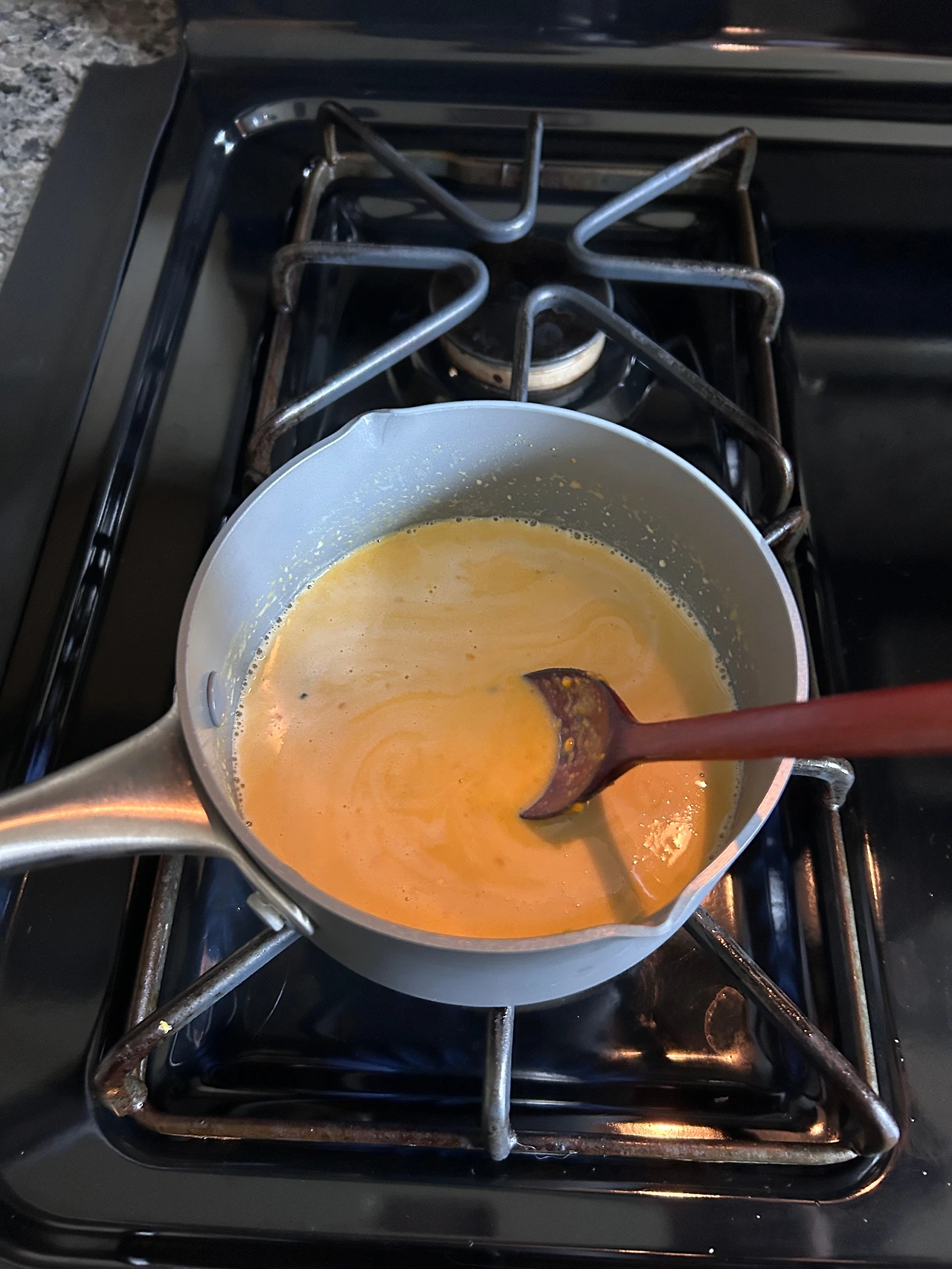 간 단호박에 우유를 더 붓고 따뜻하게 끓여준다.