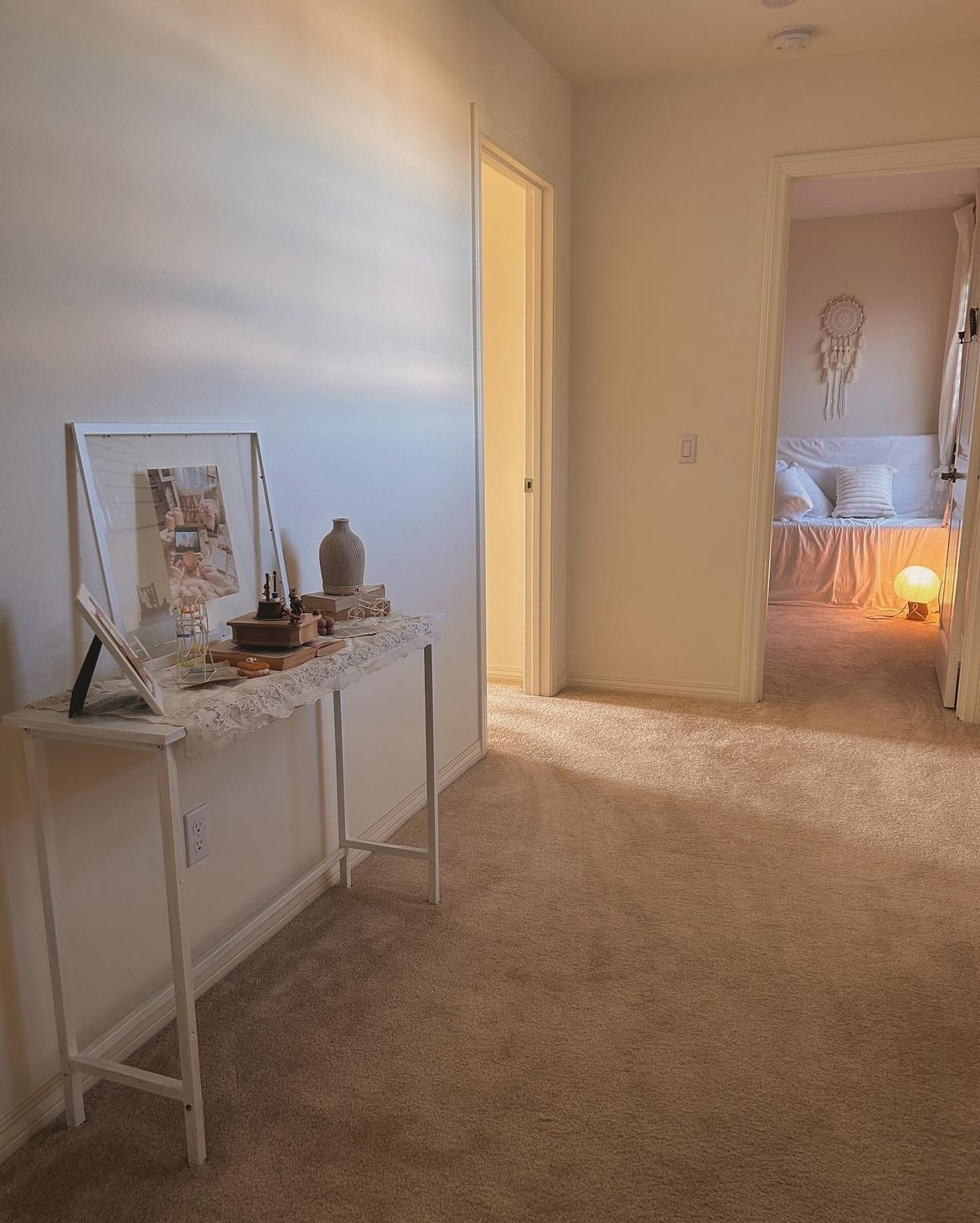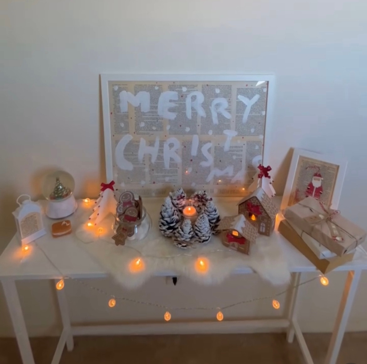 그 위에 내가 아끼는 나무 오르골과 직접 만든 우리 집모양 액자, 캔들, 꽃병등을 놓아준다.