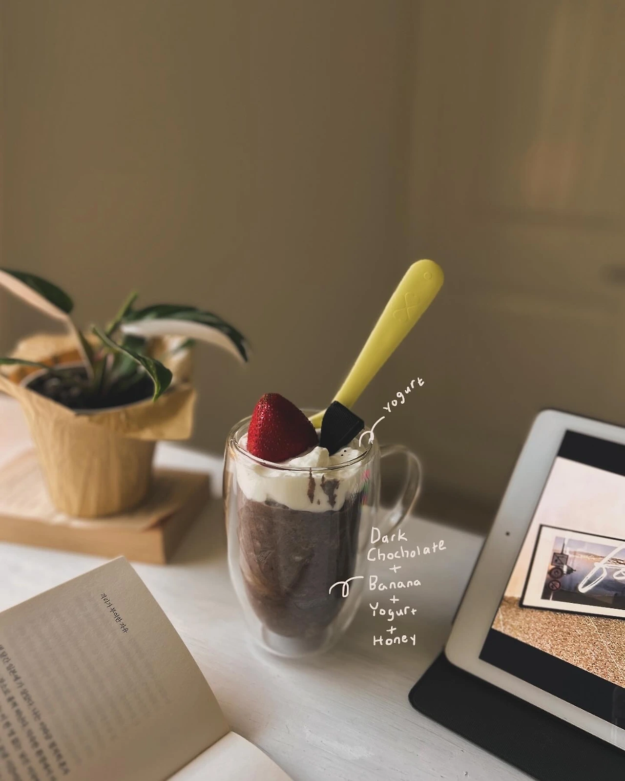 그릭요거트 +바나나+다크초콜릿+딸기+약간의 꿀을 잘 섞은 후 살짝 얼려서 먹어주면