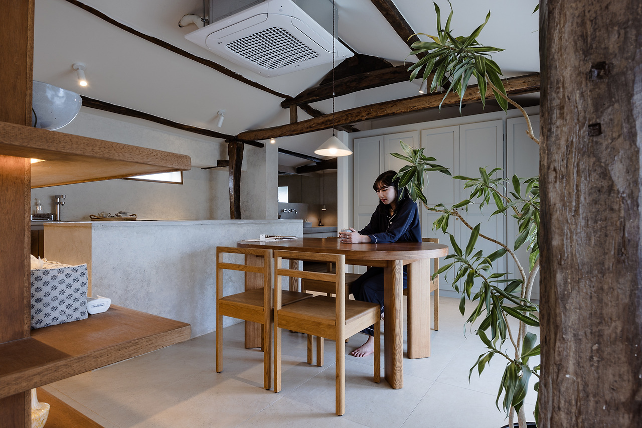 우리 셋은 '안채'에 머물렀다. 침구가 두 개였고, 최대 네 명까지 머무를 수 있는 곳이었다. 문을 열자마자 와닿던 포근한 기운과 그에 어울리는 따뜻한 색감이 이곳의 첫인상으로 남았다. 이곳에 머물 우리끼리 넉넉하게 마주하고 앉아서 밥을 나눠 먹을 식탁 그 너머엔, 식후 나른한 시간을 만들어 줄 차와 커피도 준비된 모습이었다.
