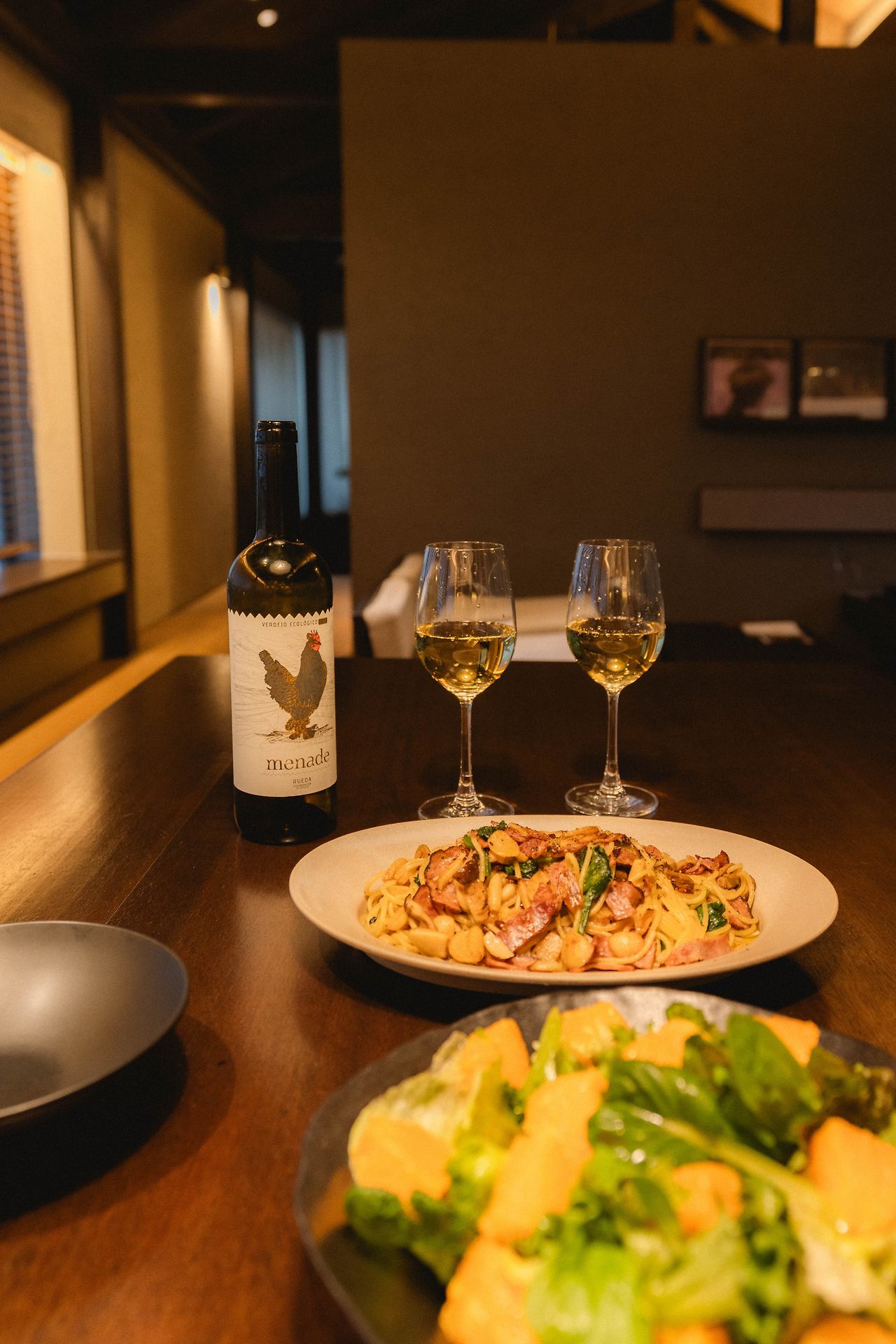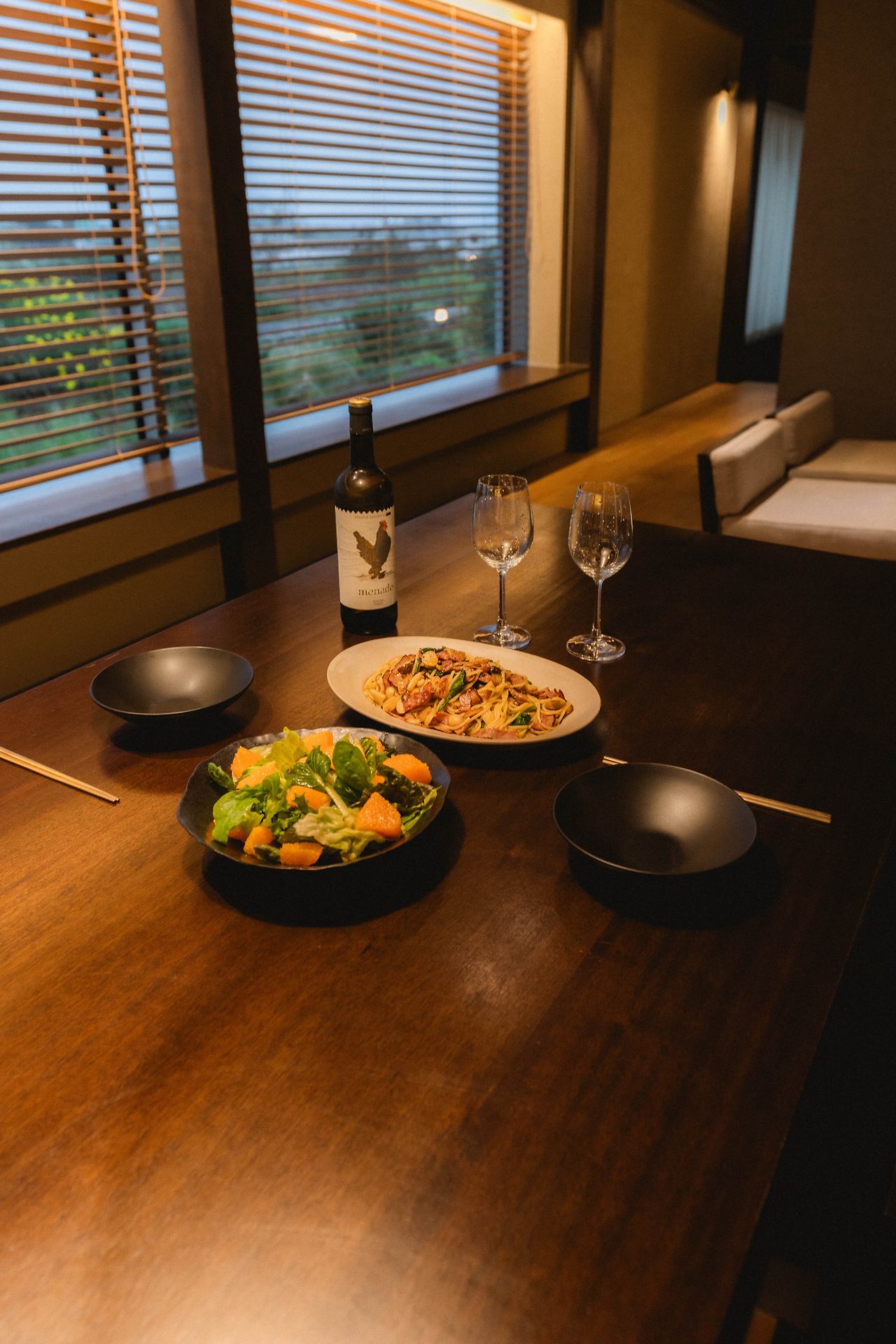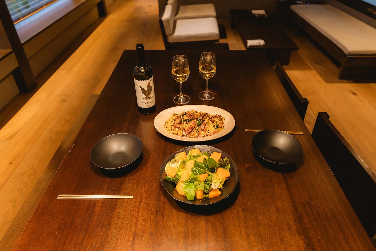공간을 둘러보고 급 풀어진 긴장 때문인지 낮잠을 조금 자다가 저녁 먹을 시간이 다 되었다. 공간과 어울릴 음식이나 술이 뭐가 있을까 고민하다 이번엔 직접 요리하기로 하고 파스타와 화이트 와인을 준비했다. 요리에 필요한 모든 식기구들이 잘 구비되어 있어서 편하게 요리할 수 있었던 점도 너무 좋았다.