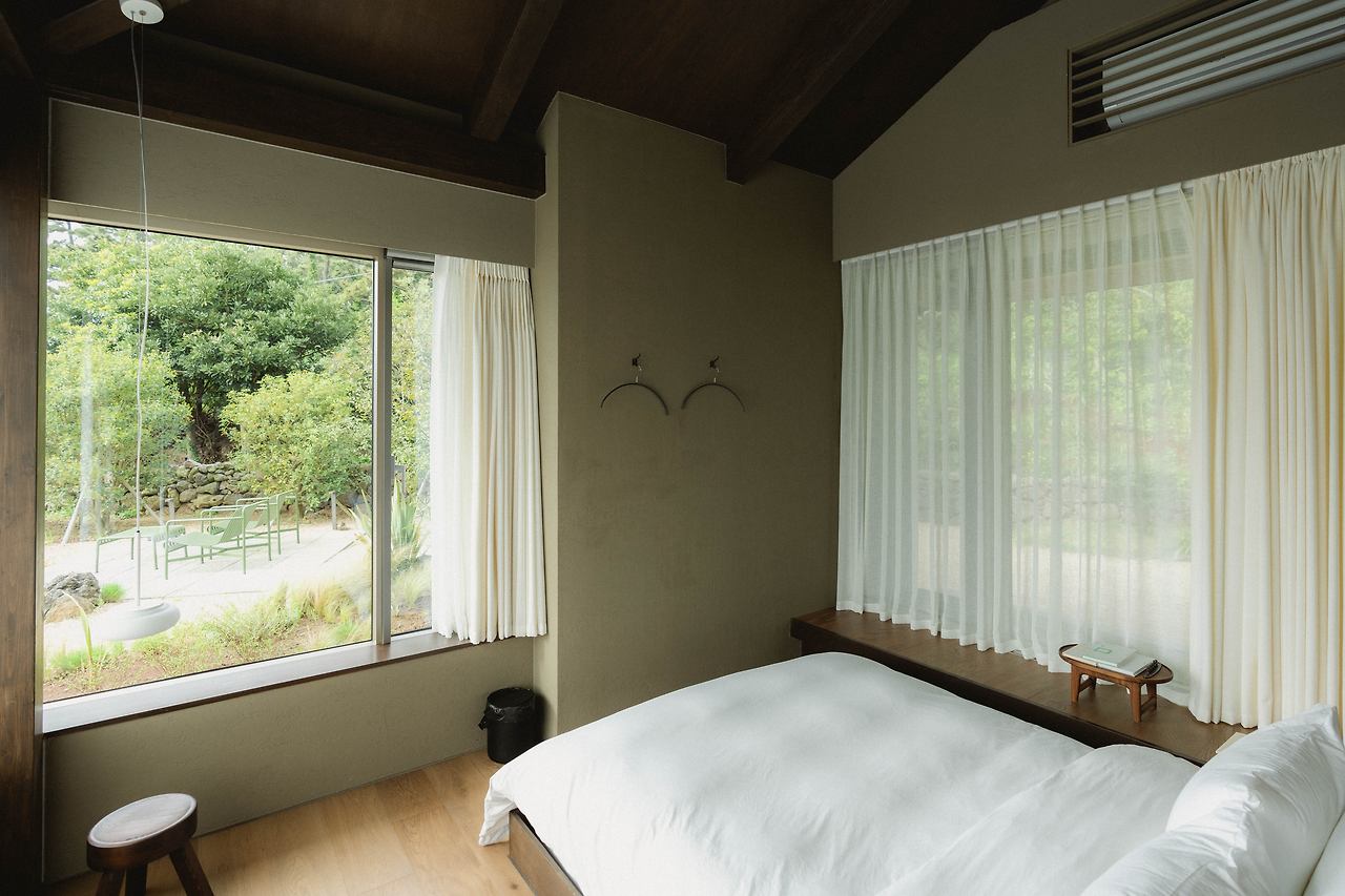 본채의 침실 공간은 약간의 단차를 두어 더 안락한 느낌이었고 창밖으로 보이는 초록색 풍경이 마음을 더 안정적인 곳으로 이끌어주었다. 침실뿐만 아니라 모든 공간에서 자연을 바라볼 수 있다는 게 정말 큰 위로가 되는 부분이었다.