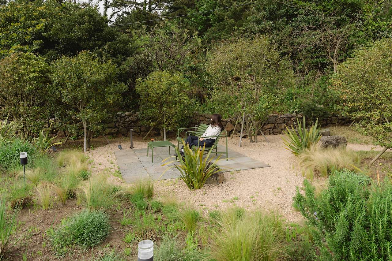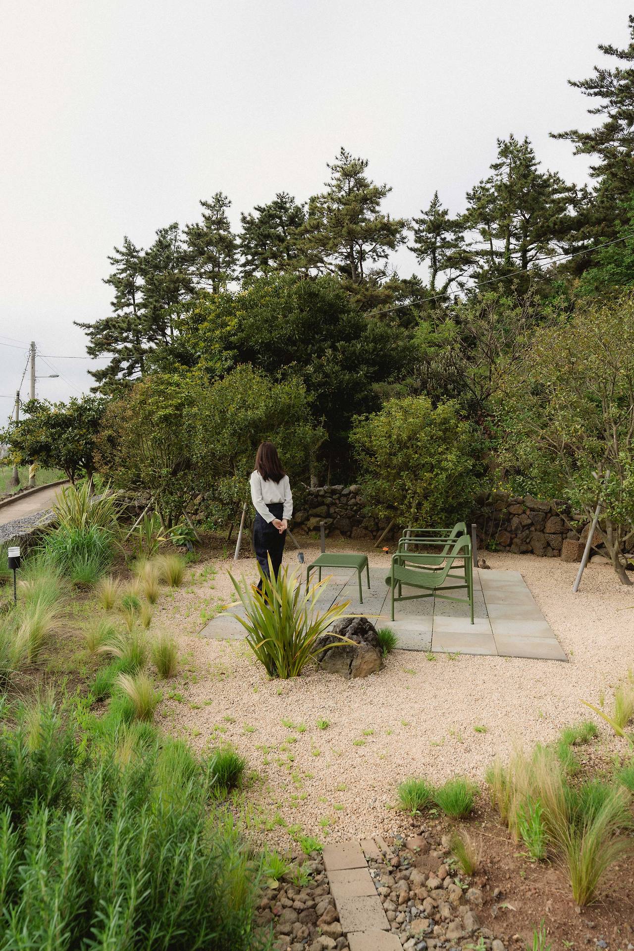 멀리 수평선을 바라보며 한없이 사색할 수 있는 의자와 테이블도 실외 한켠에 마련되어 있었는데, 어떤 각도에서 사진을 찍어도 초록한 풍경과 잘 담겨서 이곳에서 서로를 찍어주며 즐거운 시간을 보내기도 했다.