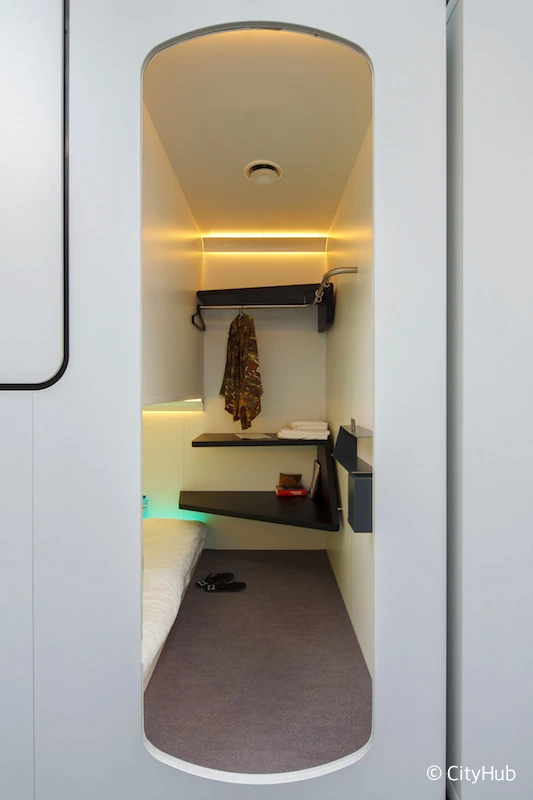 200평 규모의 산업 창고 건물에 위치한 City Hub는 50개의 수면 유닛, 허브(Hubs)로 가득 채워졌다. ‘ㄱ’과 ‘ㄴ’ 모양의 형태로 공간 활용성을 확보한 유닛은 와이파이, 콘센트와 수납 시설 등이 구비되어있고 조명, 알람 및 음악 스트리밍 시스템이 있어, 여행자가 개별로 룸 컨디션을 조정할 수 있도록 만들어졌다.