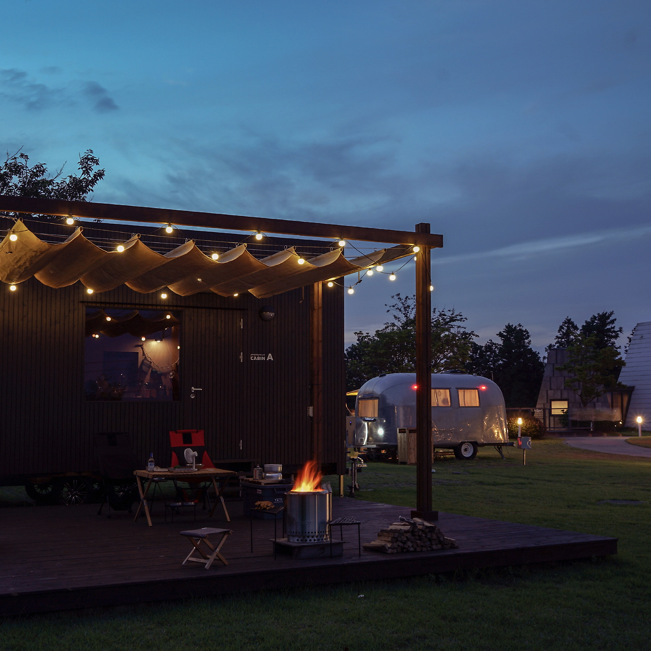 이번에 새로 오픈한 캐빈은 A와 B 이렇게 두 채가 만들어졌다. 캐빈 주변으로는 캠핑존과 에어스트림이 있어 자연스럽게 아웃도어 커뮤니티가 형성된다. 넓은 잔디로 이루어진 ‘폴리 파크’ 건너편으로는 롯지들이 사이좋게 자리하고 있다.