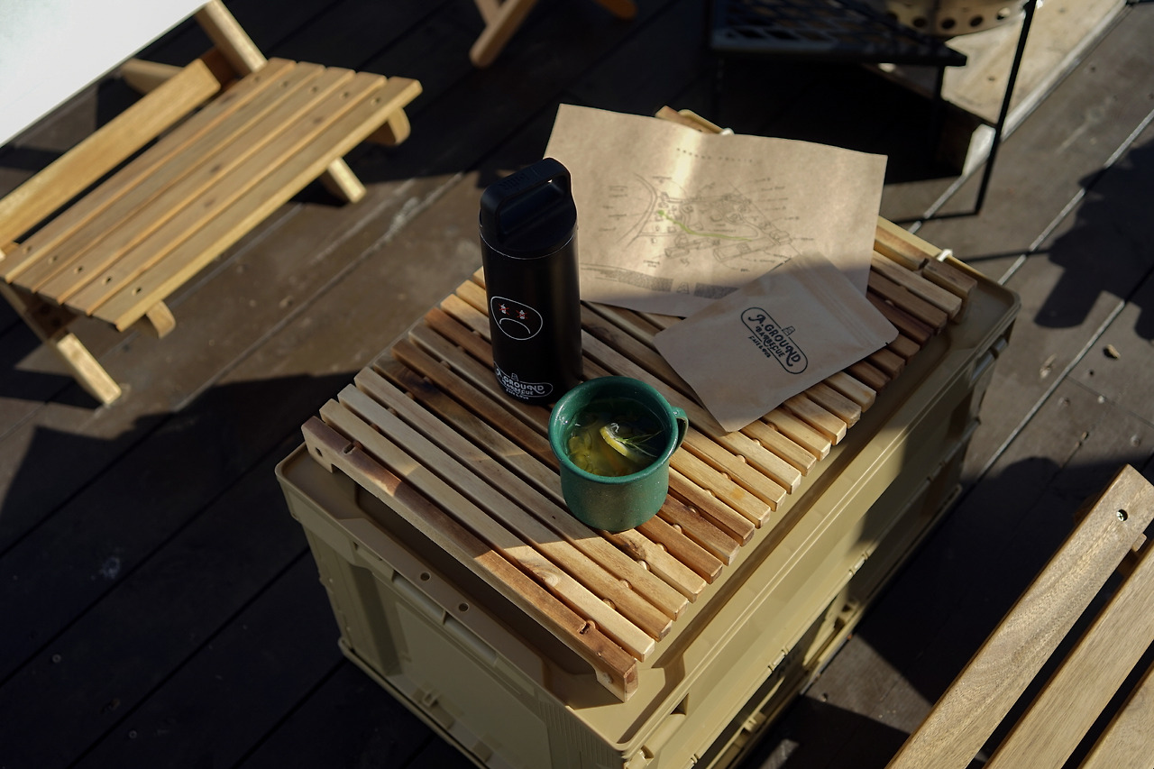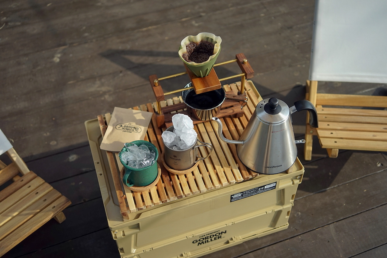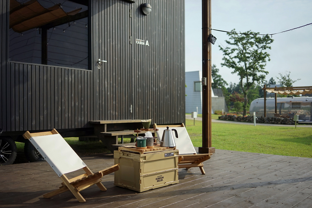 캐빈 바로 앞에는 캠핑 데크가 이어졌다. 캐빈 안에서 한 발짝만 나서면 아웃도어 라이프가 시작되는 것이다. 캐빈 내부에 마련된 로우 체어와 폴딩 박스 테이블을 펴고 준비되어 있던 브루잉 키트로 시원한 커피 한 잔을 내리며 향기로운 휴식 시간을 가졌다.