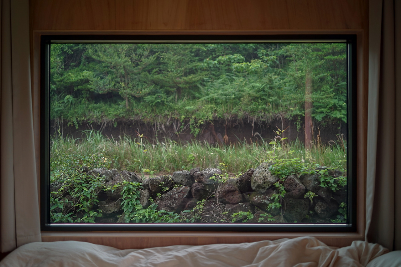 캐빈은 자연 속 최소의 집, 최소의 삶을 주제로 만들어진 공간으로 숙박할 수 있는 인원이 최대 2명인 것처럼 오롯이 나와 그리고 함께하는 단 한 사람에게만 집중할 수 있는 공간으로 구성되었다. 크기는 아담하지만 의외로 묵직했던 문을 열고 들어서니 캐빈이라는 이름처럼 온통 나무로 꾸며진 공간과 제주 돌담이 보이는 널찍한 창이 가장 먼저 눈에 들어왔다.