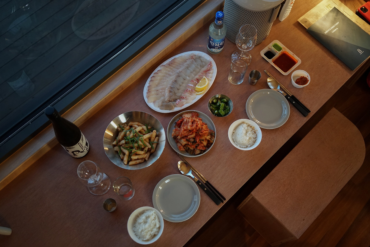 캐빈 내부는 간소하지만 수납공간을 잘 만들어 두었다. 탁자 밑에도 의자 밑에도 곳곳에 수납을 할 수 있어서 정갈하게 지낼 수 있었다. 특히 침대 밑에는 캐리어(짐 가방)가 들어갈 것을 고려하여 공간을 만들어 두었다. 최소한의 공간을 최대한 활용할 수 있는 방법으로 구성한 것 같았다.