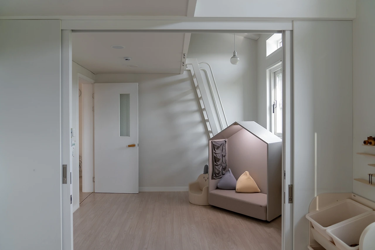 아이들이 놀기 좋을 방이기도 하지만, 장난감 블록이 이렇게 감성적일 수가. 작은 쇼파에 누워 아이들에게 책을 읽어주기도 좋을 것 같다. 방 안에 있는 사다리를 타고 올라가면 비밀스러운 공간이 나타난다.