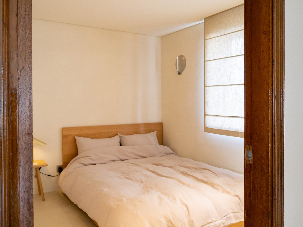 낮은 조도의 침실. 코르의 침구와 홈웨어가 준비되어 있다. 촉감도 좋고, 가볍고, 포근하고. 침실 한쪽에는 테라스로 올라갈 수 있는 계단이 있다. 천장이 낮고 계단이 가파르니 조심해서 움직여야 한다.