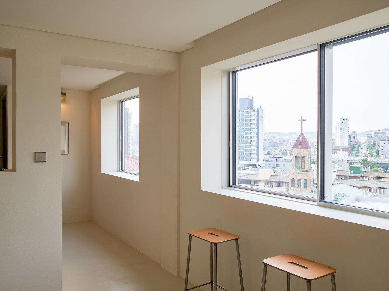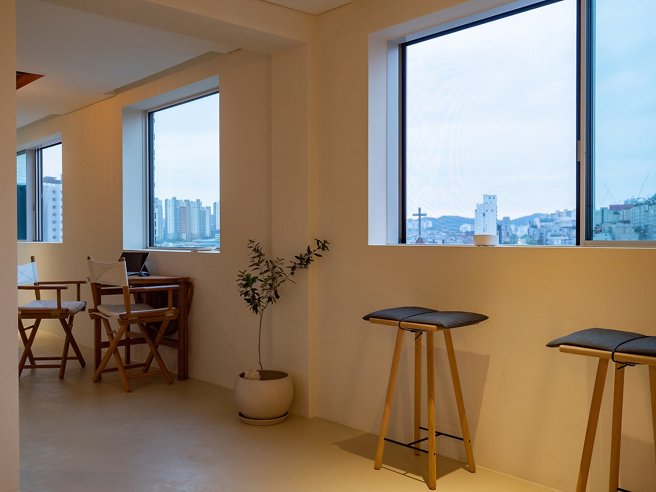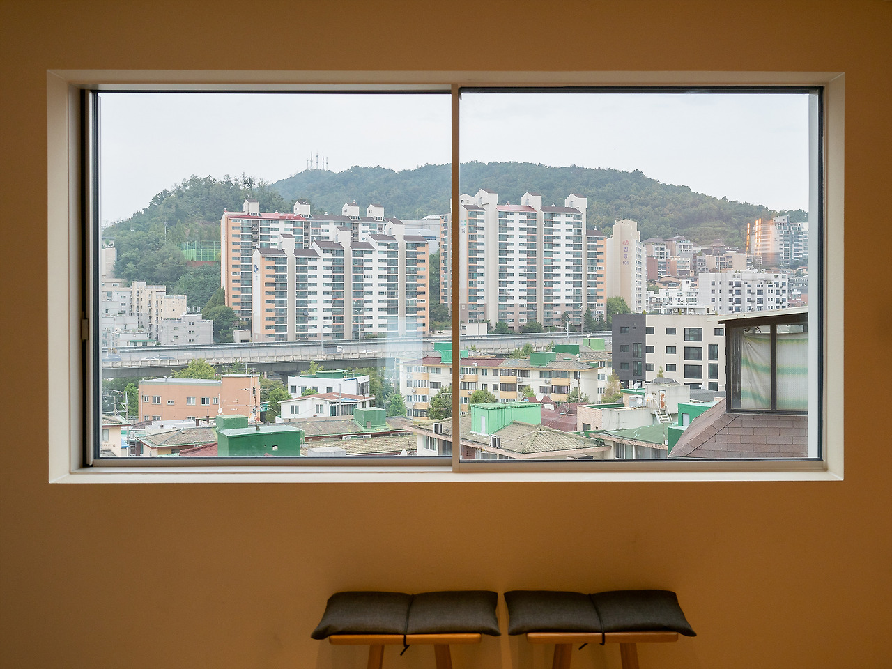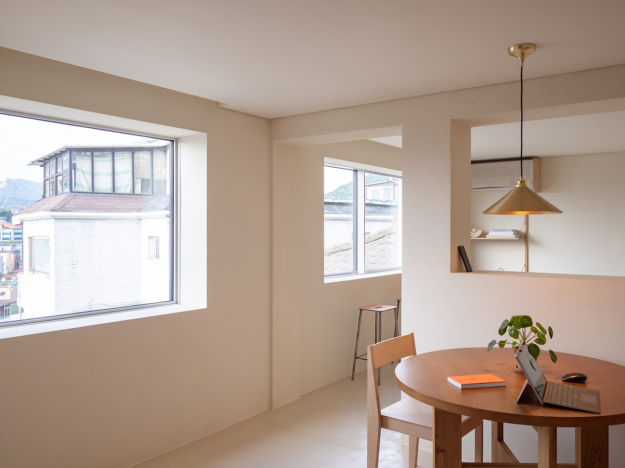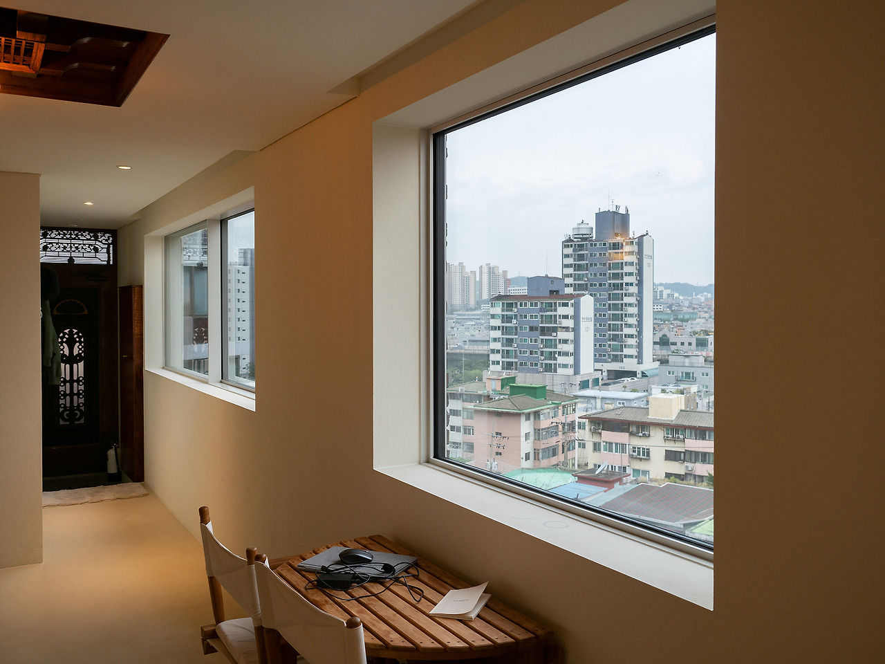 모노톤의 공간, 따뜻함을 더하는 원목 느낌의 가구들 그리고 액자처럼 보이는 맑고 커다란 창 밖으로 보이는 서대문, 연희동, 내부순환로의 모습. 근경에서 바라보는 서울의 모습은 사실 별 것 없게 느껴지기도 한다. 조금만 멀리서 보면 빽빽한 아파트 마저도 다르게 보일 수 있다. 힘들게 찾아온 연희동의 어딘가. 익숙한데 낯선 서울의 모습을 움직이는 액자처럼 감상할 수 있다.