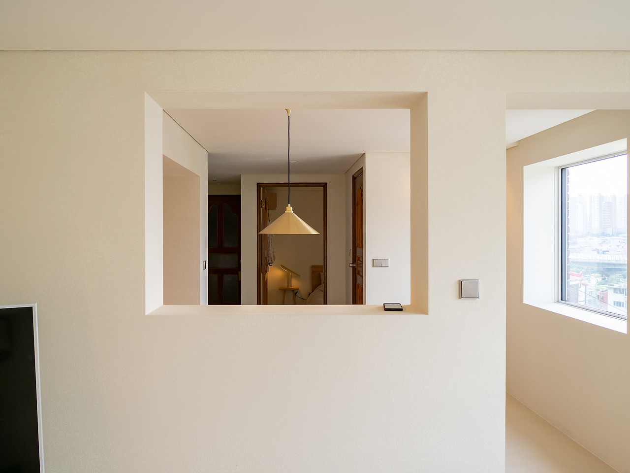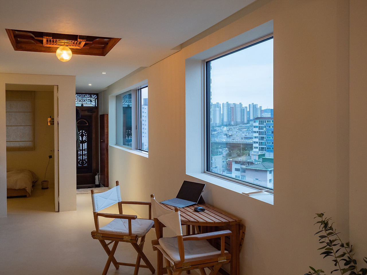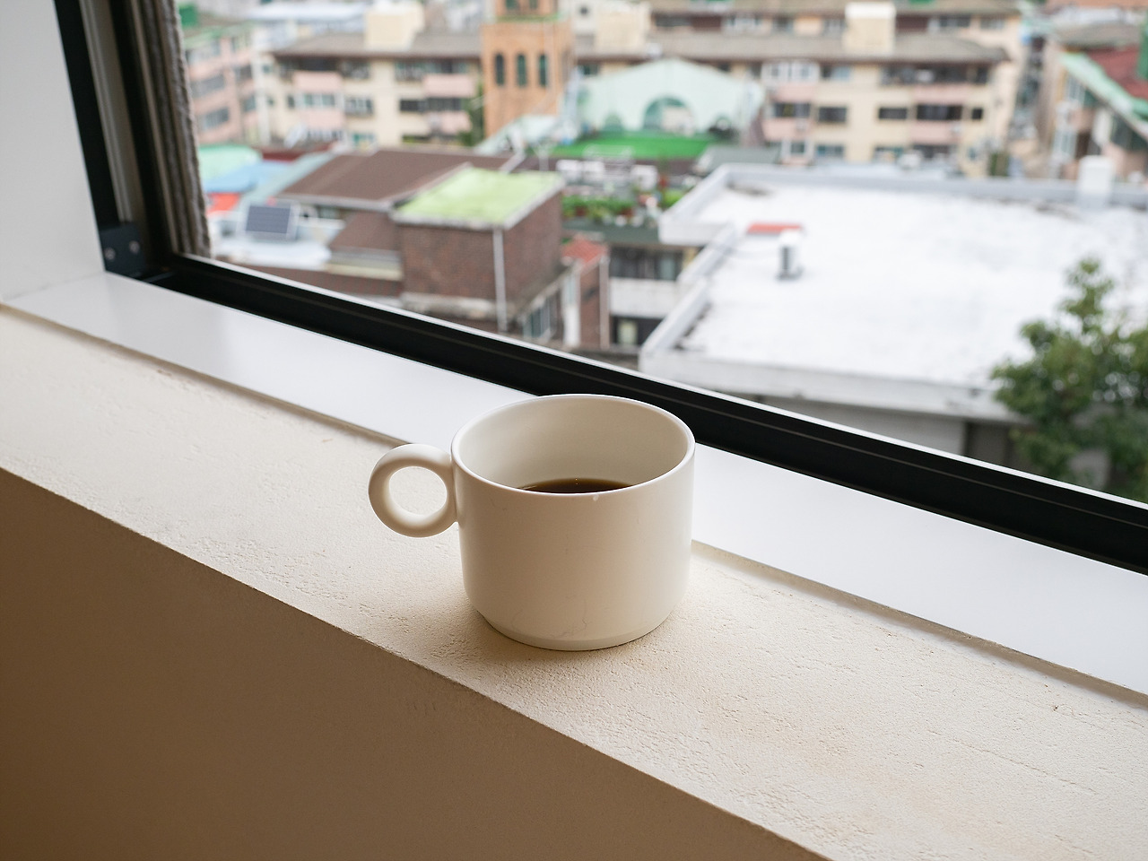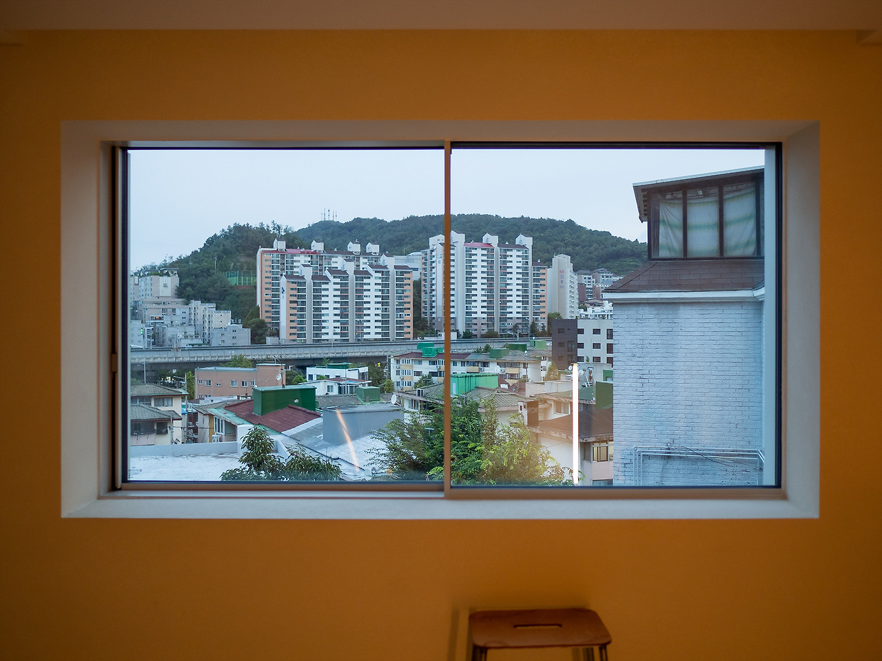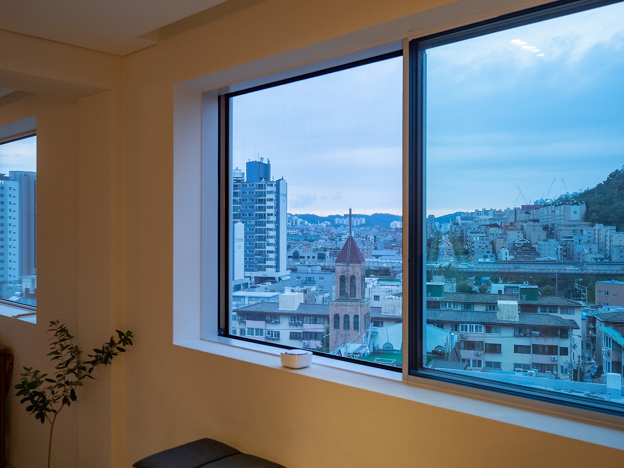 모노톤의 공간, 따뜻함을 더하는 원목 느낌의 가구들 그리고 액자처럼 보이는 맑고 커다란 창 밖으로 보이는 서대문, 연희동, 내부순환로의 모습. 근경에서 바라보는 서울의 모습은 사실 별 것 없게 느껴지기도 한다. 조금만 멀리서 보면 빽빽한 아파트 마저도 다르게 보일 수 있다. 힘들게 찾아온 연희동의 어딘가. 익숙한데 낯선 서울의 모습을 움직이는 액자처럼 감상할 수 있다.