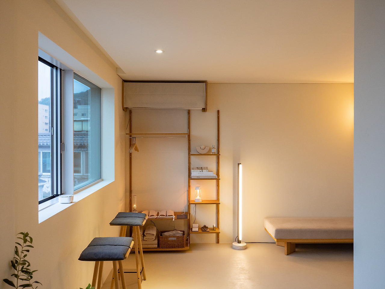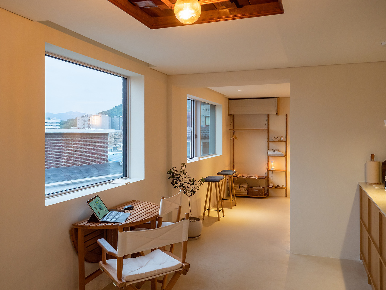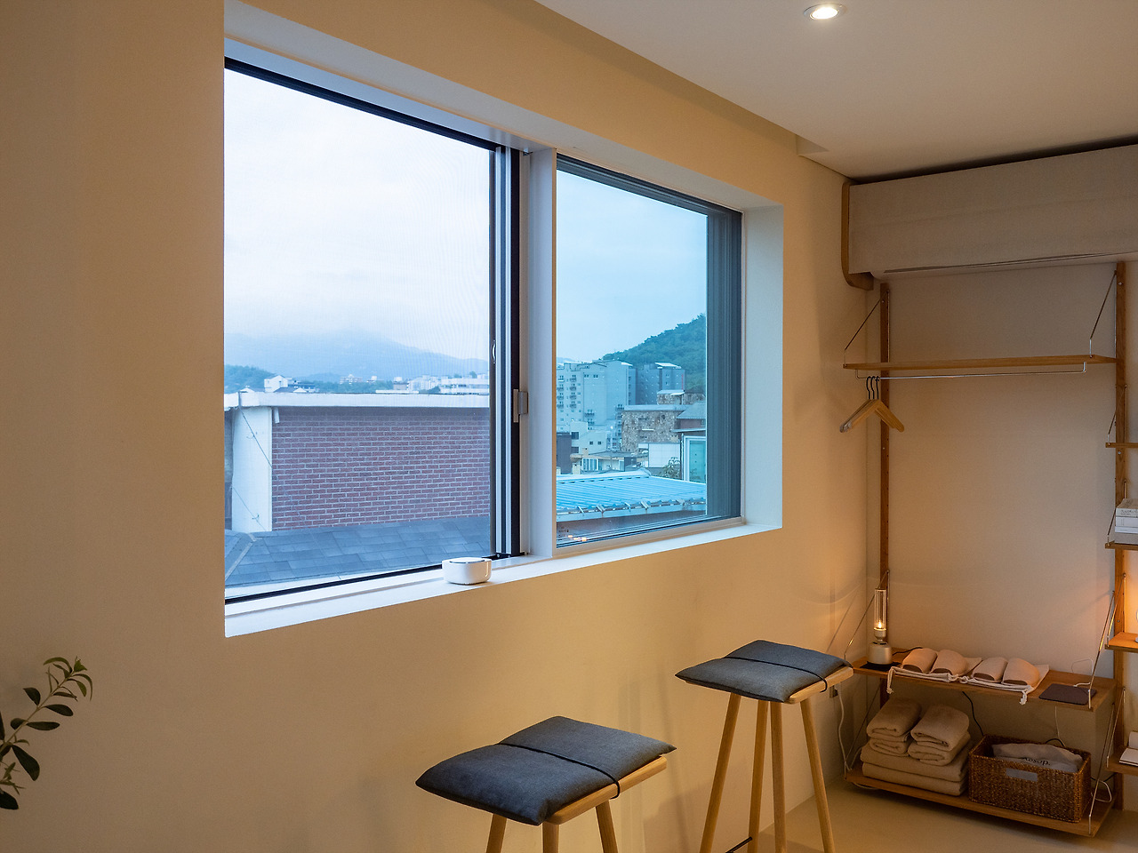 옷걸이 겸 장식장은 에어컨 밑에 위치했고, 노모어에 있으면서 중요하게 사용될 다양한 물건들이 배치되어 있다. 피드백이 있었는지 창문 앞에 놓인 의자에는 작은 방석이 귀엽게 매달려있었다. 덕분에 오랫동안 앉아있어도 불편하지 않았다.