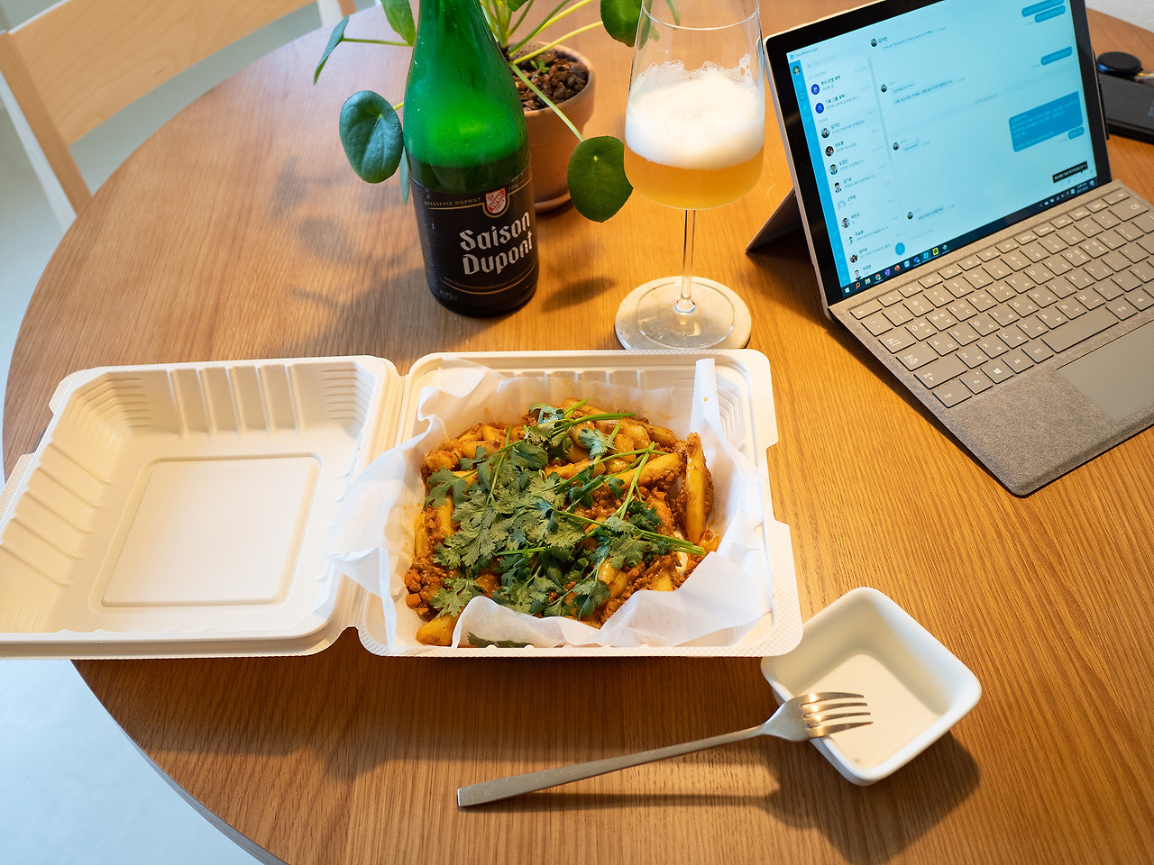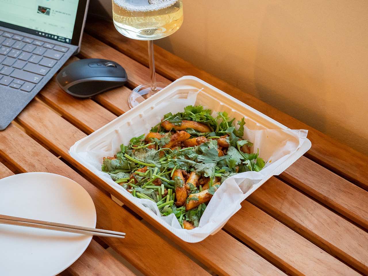 근처에서 배달시킨 고수가 듬뿍 올라간 라구 떡볶이, 바로 앞 편의점에서 구입한 화이트 와인. 요즘 가장 좋아하는 조합이다. 맥주를 마실까 했었는데 테라스를 구경하고 나니 와인을 사지 않을 수 없었다. 늦은 저녁 시간이 기다려진다.