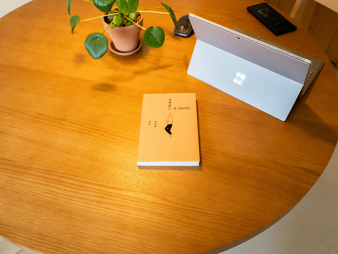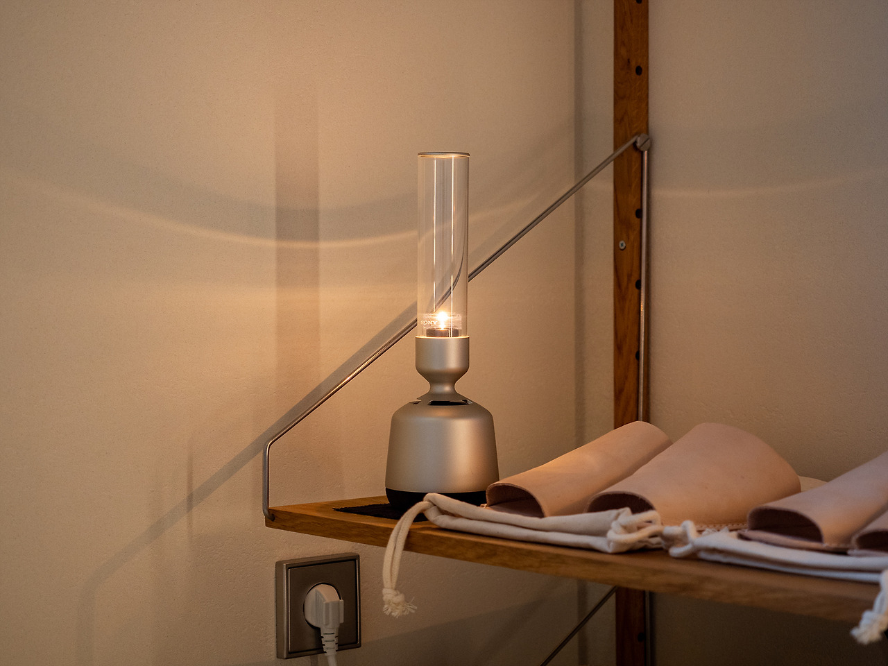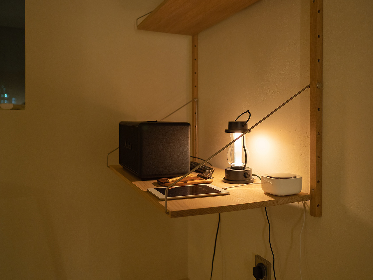 처음엔 그냥 조명인가 했는데, 블루투스 스피커였다. 작지만 나쁘지 않은 음질이었고, 배터리로 작동하다 보니 여기저기 이동하면서 듣기 좋았다. 나중에 다시 설명하겠지만, 이동할 수 있는 스피커가 꽤 중요한 포인트다. 발뮤다의 예쁜 랜턴 형태의 조명도 자리를 차지하고 있다. 노란색 간접 조명은 언제 봐도 기분이 좋다.