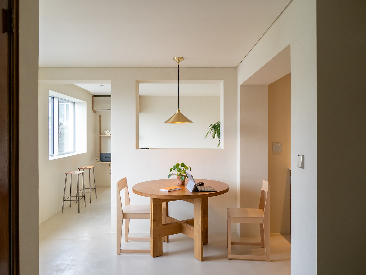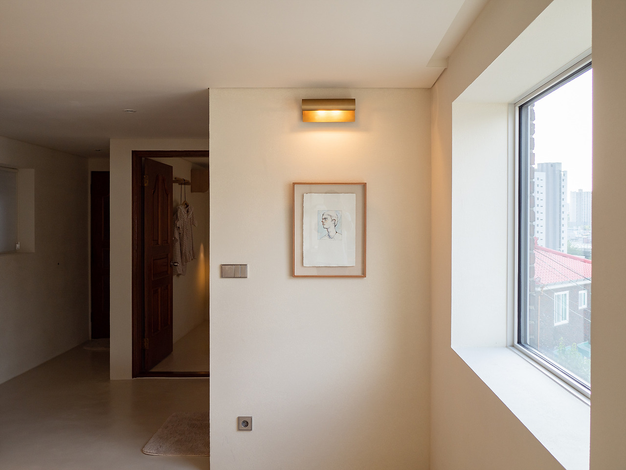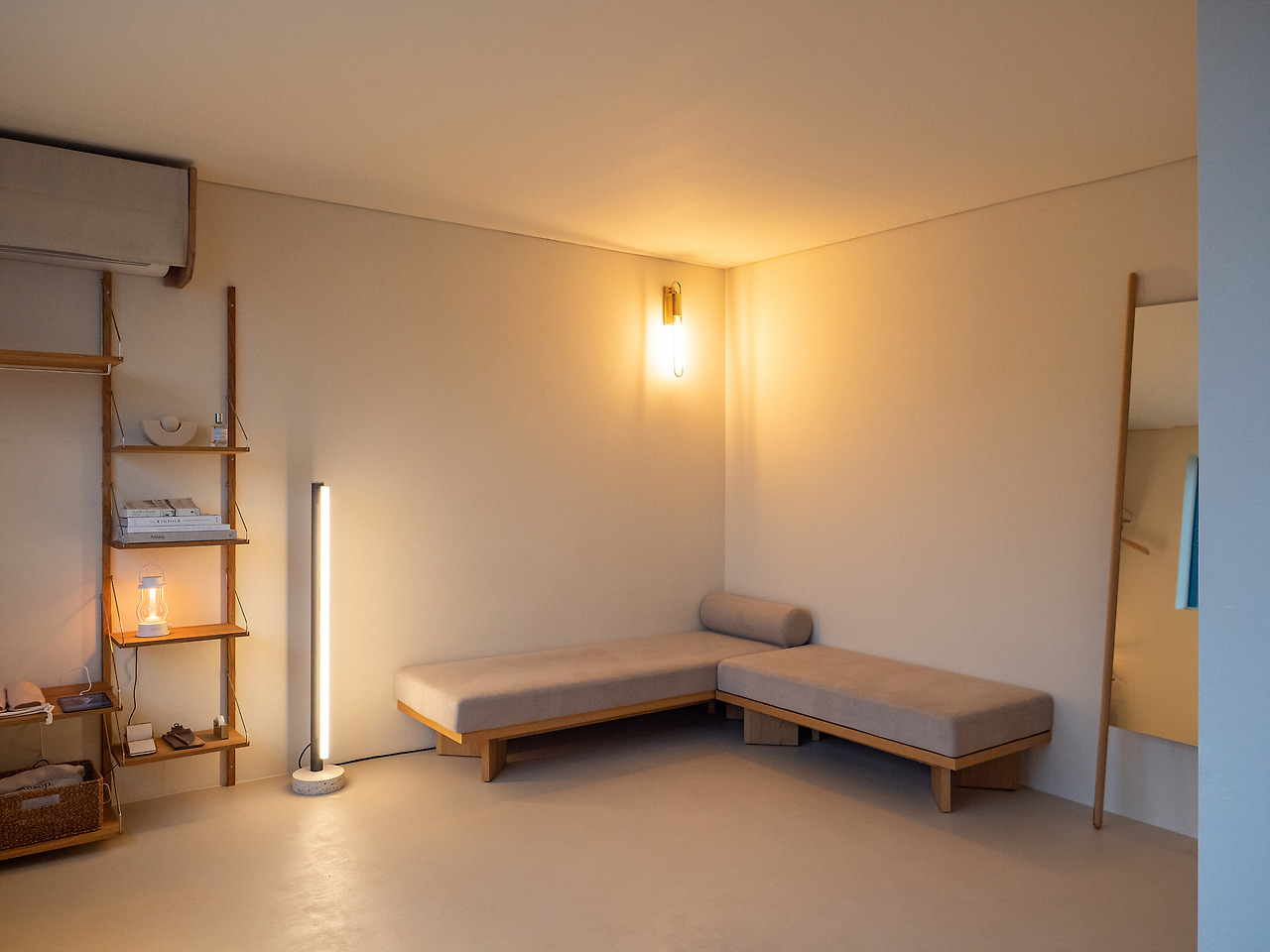 회백색의 바닥, 벽, 천장은 심심할 수 밖에 없다. 원목 느낌의 가구를 적절히 배치하고 황동 느낌의 조명을 포인트로 올렸다. 처음엔 그냥 그렇구나 싶다가 조금 지나면 그 가치를 느끼게 된다. 차갑고 세련되기만한 공간은 매력 없다.