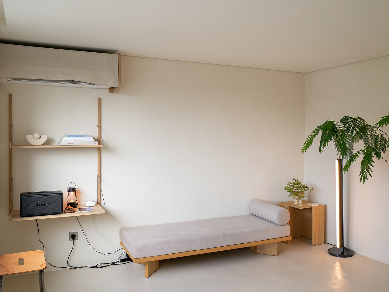 평면도에서는 리빙룸으로 표현하는 공간. 리빙룸보다는 간이 침실, 티룸 정도가 맞지 않을까 싶기도 한데. 딱딱한 침대는 기대거나 앉아서 술을 마시기 좋고, 커다란 스피커와 여기저기 놓인 간접 조명은 조금 더 어두워지는 순간을 기대하게 만든다.