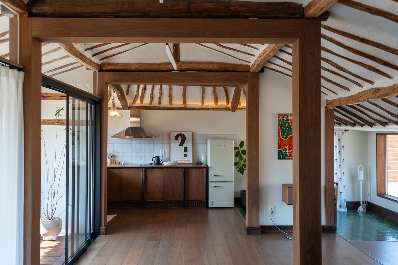 우드와 화이트 톤을 베이스로 침실, 거실, 주방, 다이닝 공간, 욕실로 이루어져 있었다. 본채의 창은 모두 시원시원하게 컸는데, 빽빽한 건물들 사이에서 서로의 프라이버시를 지키려고 답답한 블라인드를 늘 쳐두는 서울에서는 즐길 수 없었던 '창 너머로 넓은 마당과 하늘을 바라보는 일'은 꽤 즐거웠다.