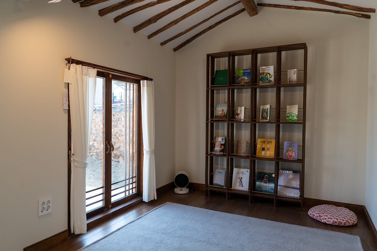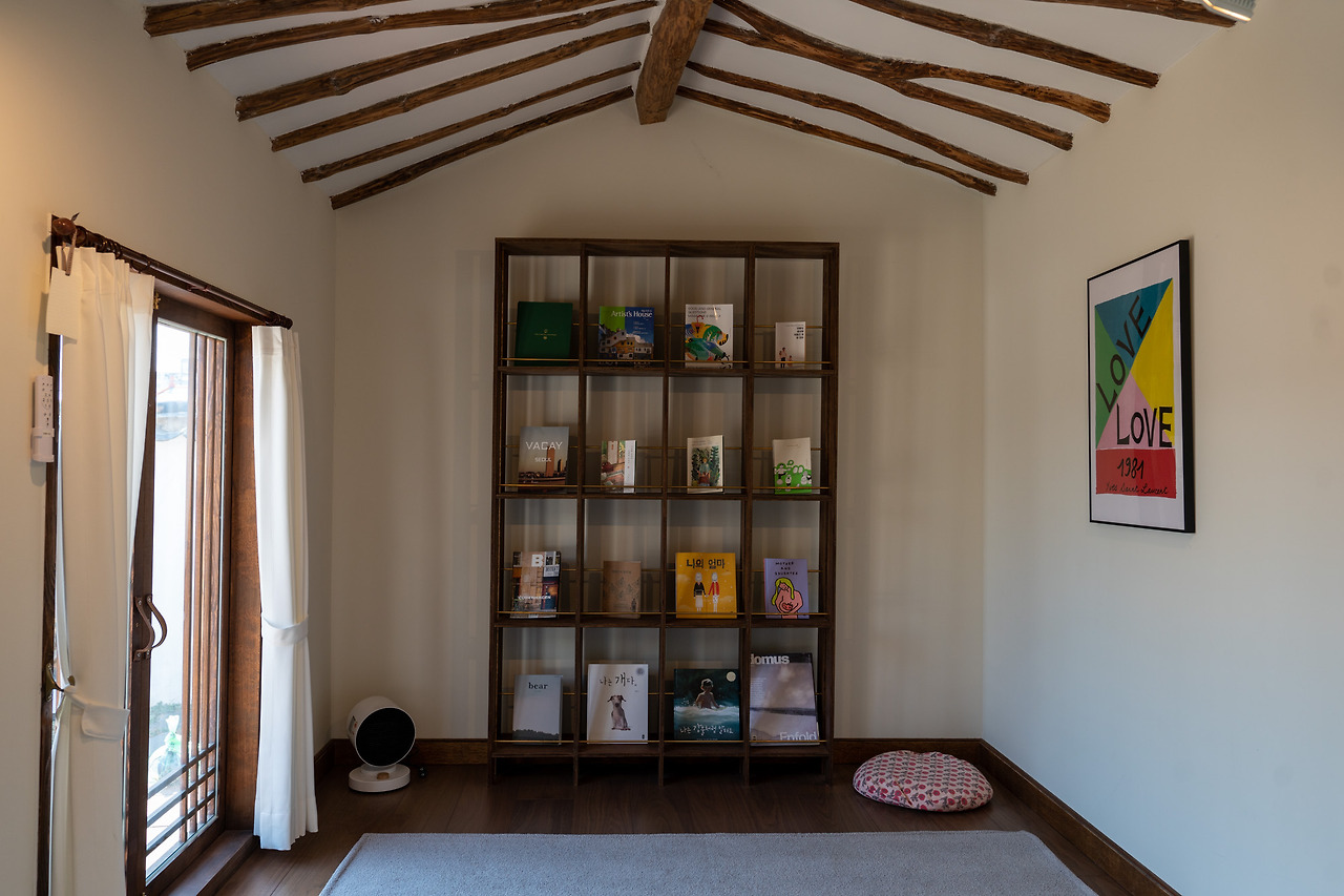 커피를 마시고는 별채 서가에서 시간을 보냈다. 다른 사람의 플레이리스트를 듣는 것만큼이나 즐거운 게 책장을 들여다보는 것인데, 흥미로워 보이는 책이 많았다. 서가에는 빔프로젝터도 있어 미디어도 즐길 수 있다.