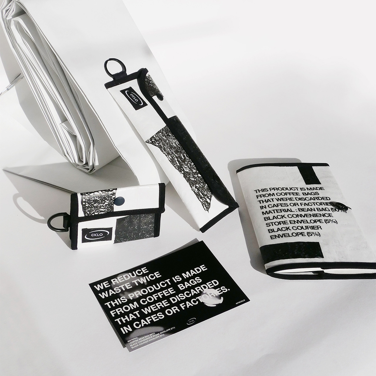가장 흔하게 버려지는 검은 쓰레기 봉투로 제작되어 모든 색을 아우르는