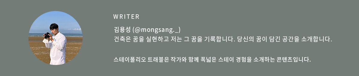 지금 나는 건축사진작가라는 직업으로 일상을 보내고 있다. 지금의 직업 역시 스테이를 운영하고자 하는 마음가짐에서 얻게 된 직업이다. 나의 공간을 위해 남의 공간을 무수히 많이 방문했다. 영감을 위해 관찰했고 아쉬웠던 점을 기억하기 위해 기록했다. 그렇게 내가 남긴 기록들은 어느새 인정받으며 가치를 얻었다. 그게 지금의 활동명 ‘몽상’이 되었다.