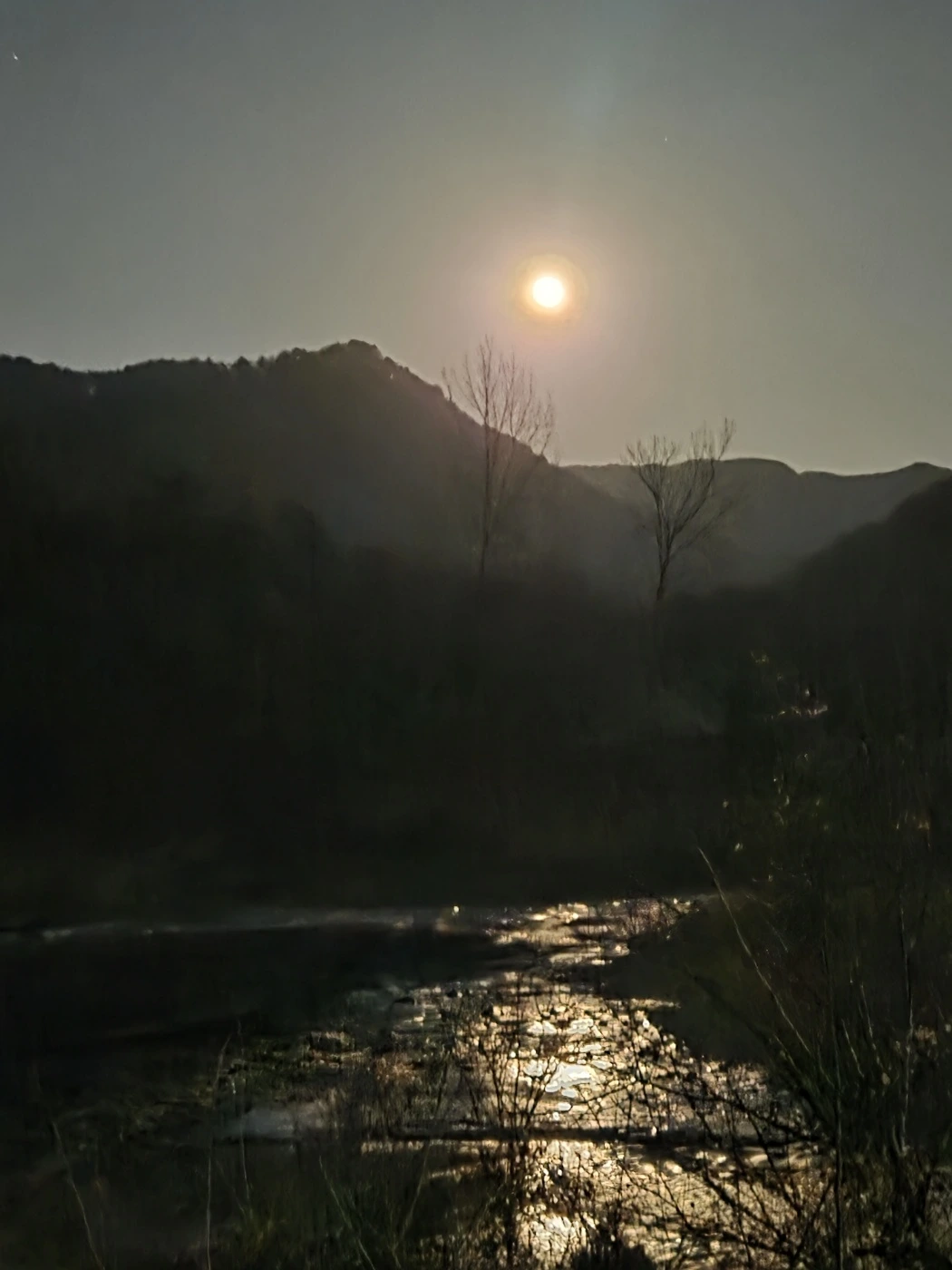 물 위로 달빛과 장엄한 산이 그대로 드리워져 있다.