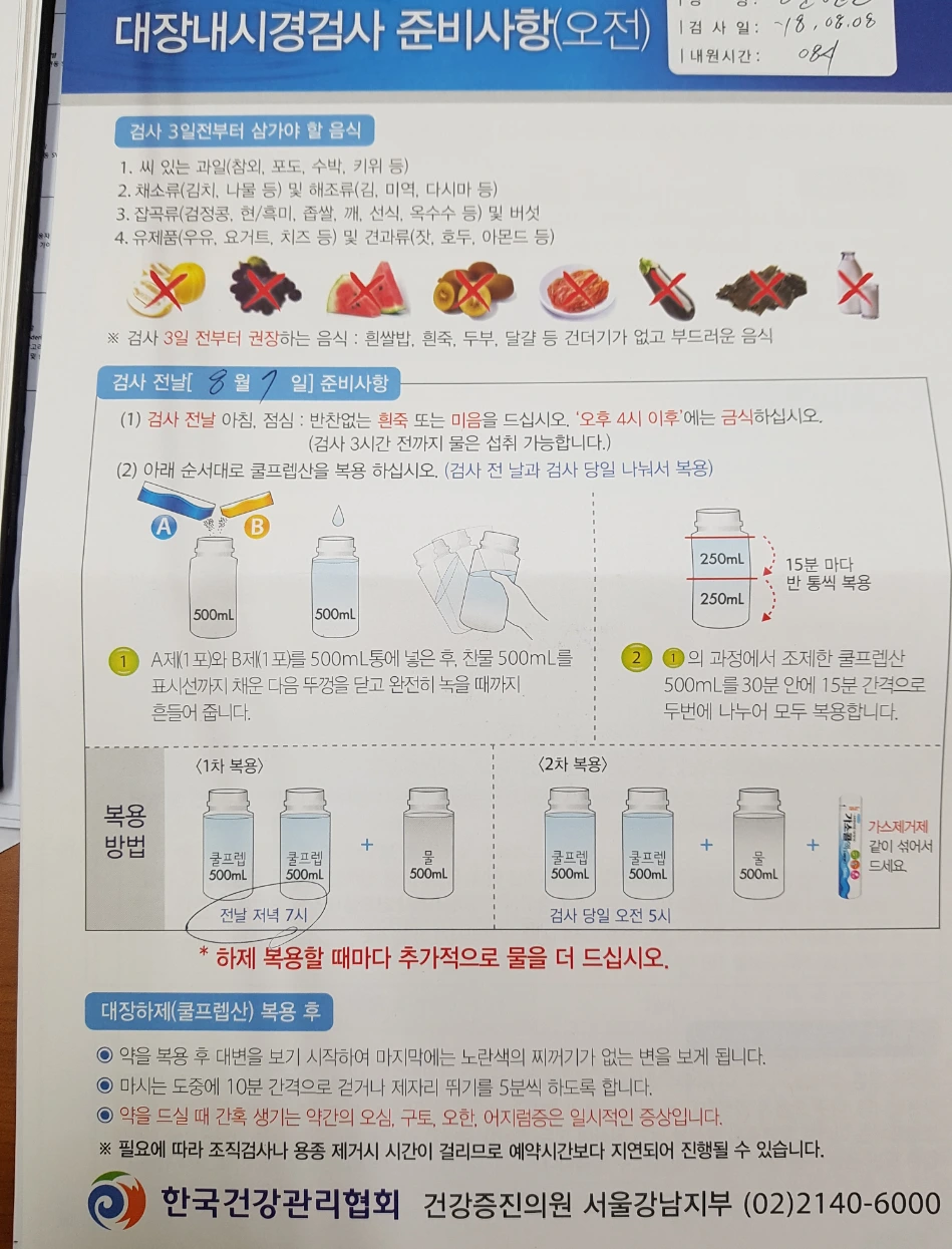 왜 전날 7시부터 장정결제를 복용하라 할까 생각해보니 이제 이해가 간다. 복용후부터 뒷처리까지 최소 2시간은 걸리니 그렇다. 물론 새벽에 자다가 한번더 화장실에 가야했다.