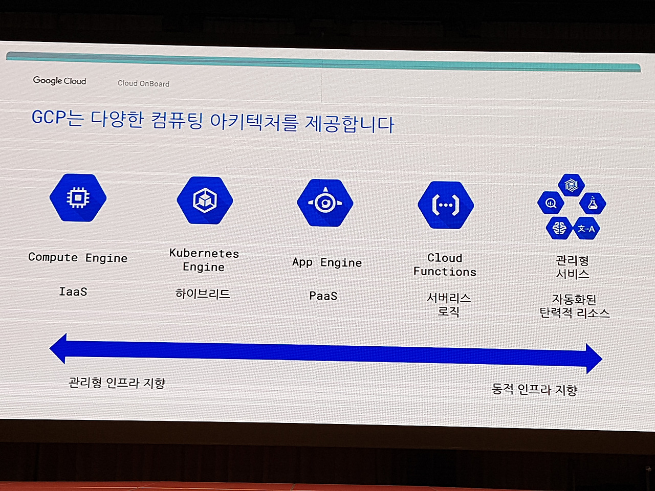 GCP는 컴퓨팅아키텍처의 스펙트럼 제공: IaaS(Compute 엔진), Kube 엔진, PaaS(App엔진), 서버리스로직(클라우드 Functions), 관리형 서비스를 제공