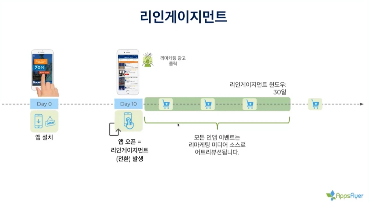 앱을 가진 유저가 리마케팅을 통해 앱을 실행하게 됐을 때 적용되는 내용으로, 이때 앱 내 이벤트가 발생했을 때, 리마케팅 리인게이지먼트에 포함된다.
