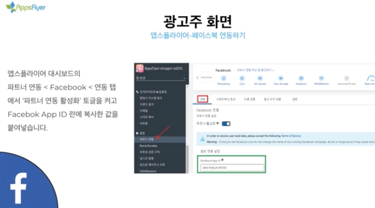 페이스북의 경우 앱 디벨로퍼 관리자에서 우선 해당 앱을 등록해줘야 한다. 앱 디벨로퍼 관리자에서 앱 ID 숫자를 앱스플라이어 내 페이스북 연동탭에서 입력해주면 된다. 그리고 대행사에서 별도로 페이스북 광고를 운영 시 앱 ID를 광고로 운영할 수 있도록 권한을 부여받아야 해서 광고 계정 ID 입력 및 대행사의 비즈니스 관리자에게 앱 권한을 공유해주면 된다.