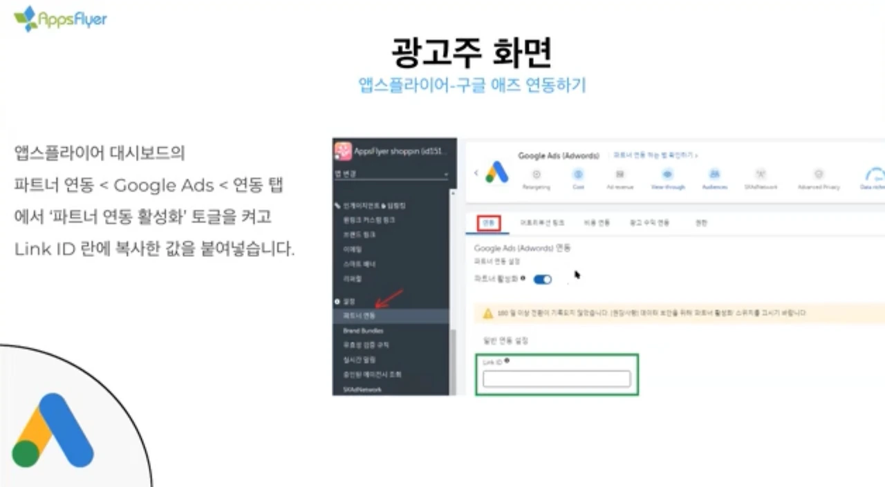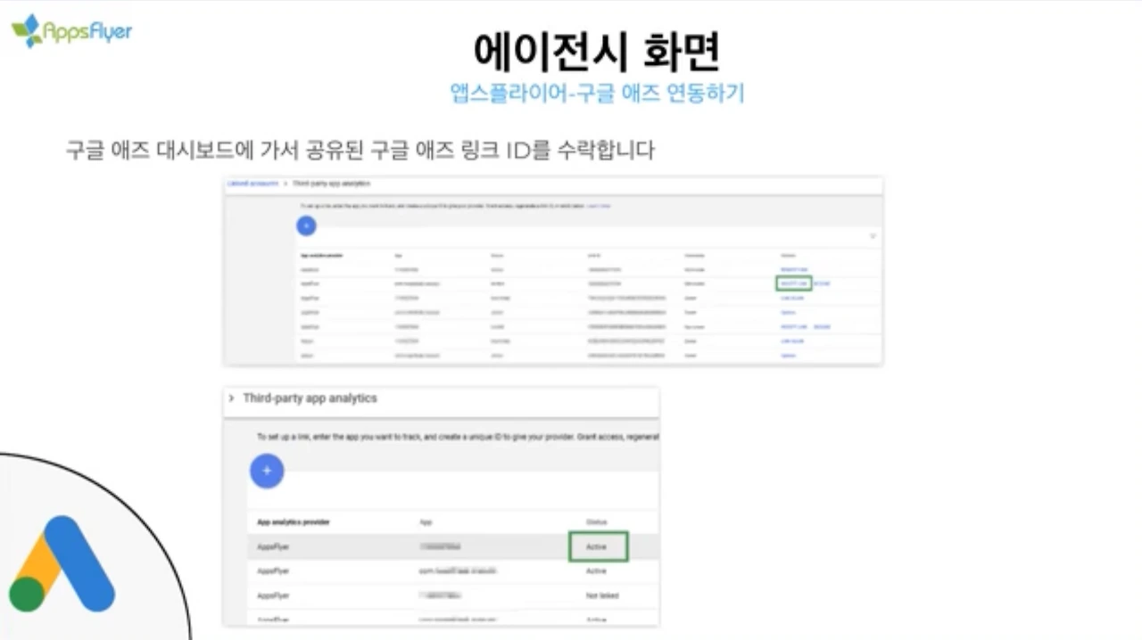 * 앱스플라이어에 입력할 수 있는 링크 ID는 1개만 가능하며, 혹시 대행사에서 별도로 구글 AC 광고를 진행 시 링크 ID를 대행사 에이전시 구글 애즈 계정으로 공유해줘야 한다. 그리고 에이전시 앱스플라이어에서는 링크 ID가 확인될 거고 운영 중인 구글 애즈 계정의 CID를 입력해주면 된다.