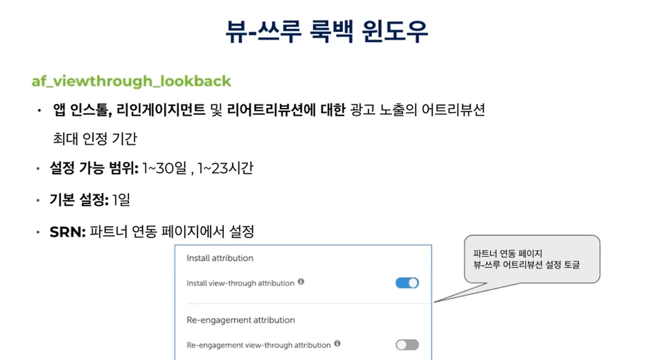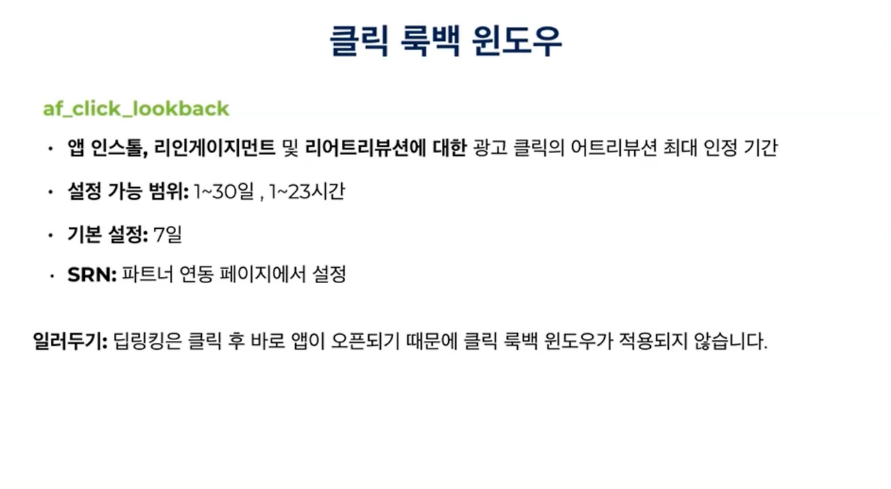 매체마다 룩백 윈도우를 정의하는 기간이 다른데, 그러다보니 앱스플라이어와 매체 간 성과 차이가 발생할 수 있다. 그렇기 때문에 최대한 성과 차이를 유사한 수준으로 하기 위해선 매체와 앱스플라이어의 룩백 윈도우 기간을 동일하게 설정해줘야 한다.