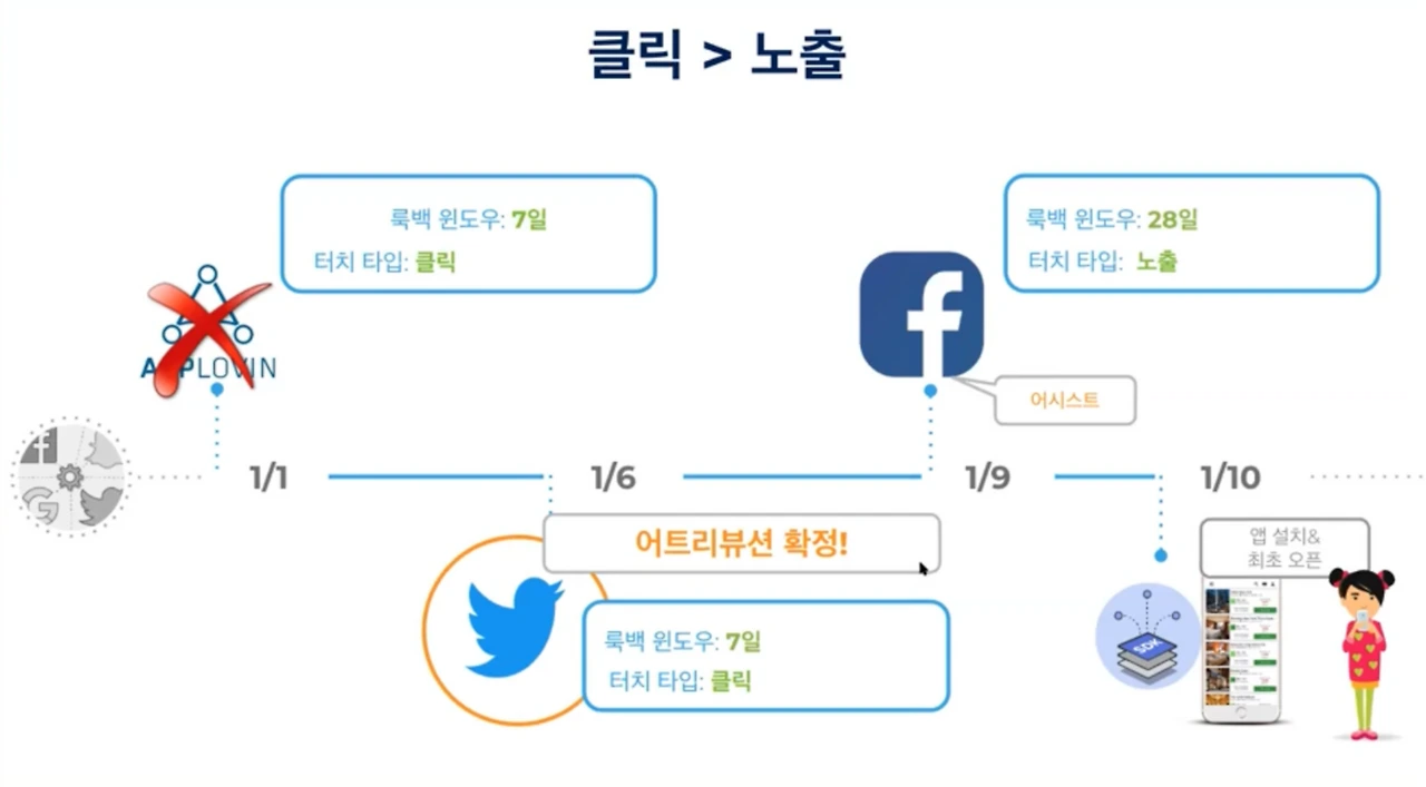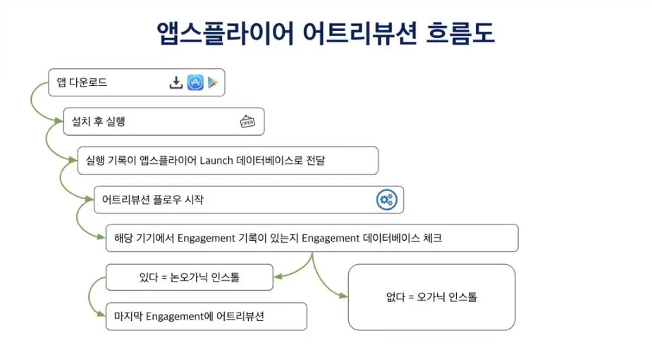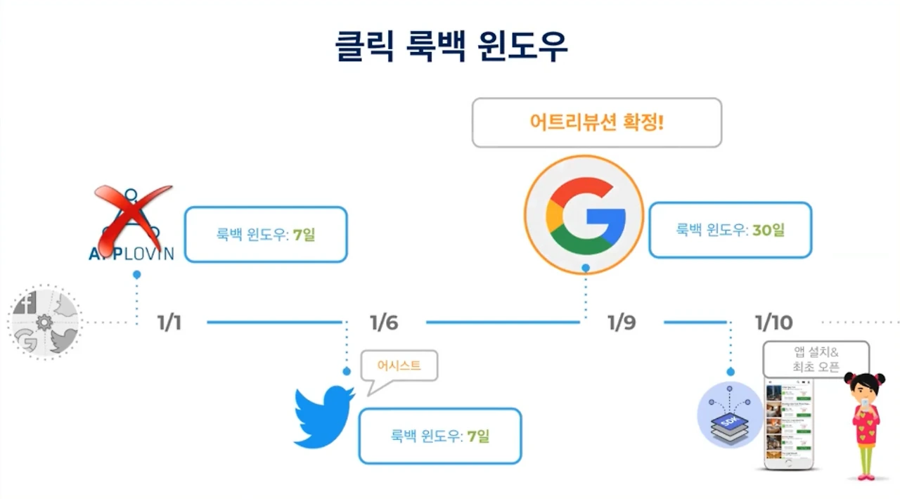 * 앱스플라이어의 경우 유저가 여러 광고를 보고 앱을 다운로드 후 실행을 했다면, 가장 마지막에 본 광고에, 그리고 노출 보다는 클릭을 한 광고에 기여가 귀속된다.