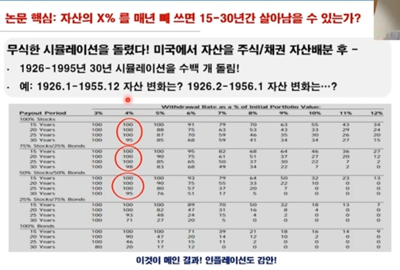 최근 FIRE(경제적 자유 조기 은퇴) 책으로 유명한 강환국 저자의 유튜브 채널에서 논문을 바탕으로 이 질문에 답을 잘 설명했다. 해당 논문의 주제는 (미국 주식 / 미국 채권)을 자산배분해서 1년에 몇 %를 빼먹으면 은퇴 자금의 고갈 없이 살아남을 수 있냐이다.