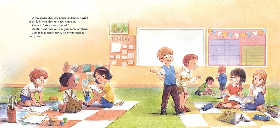 여기에 나오는 캐릭터 역시 한국인인데, 자신의 독특한 이름 때문에 학교에서 놀림을 받고 자신의 이름에 불만을 가진 어린 여자아이로 나온다. 미국은 다문화 국가여서 정말 다양한 문화적 배경의 생소한 이름들이 정말 많다! 아시안 계뿐만 아니라 아프리카, 인도, 중앙아시아, 이슬람계 이름 등 한 번도 못 들어본 이름들이 많아서 어떤 건 외우기가 참 어렵다. 우리에게는 소라라는 이름이 친숙하겠지만, 'Sarah' 같은 유럽계 이름에 익숙한 백인들에게는 역시 낯설 수 있다. 이 그림책은 그런 생소한 이름을 가진 아이가 자신의 정체성을 찾아가는 과정을 그린 책이다.