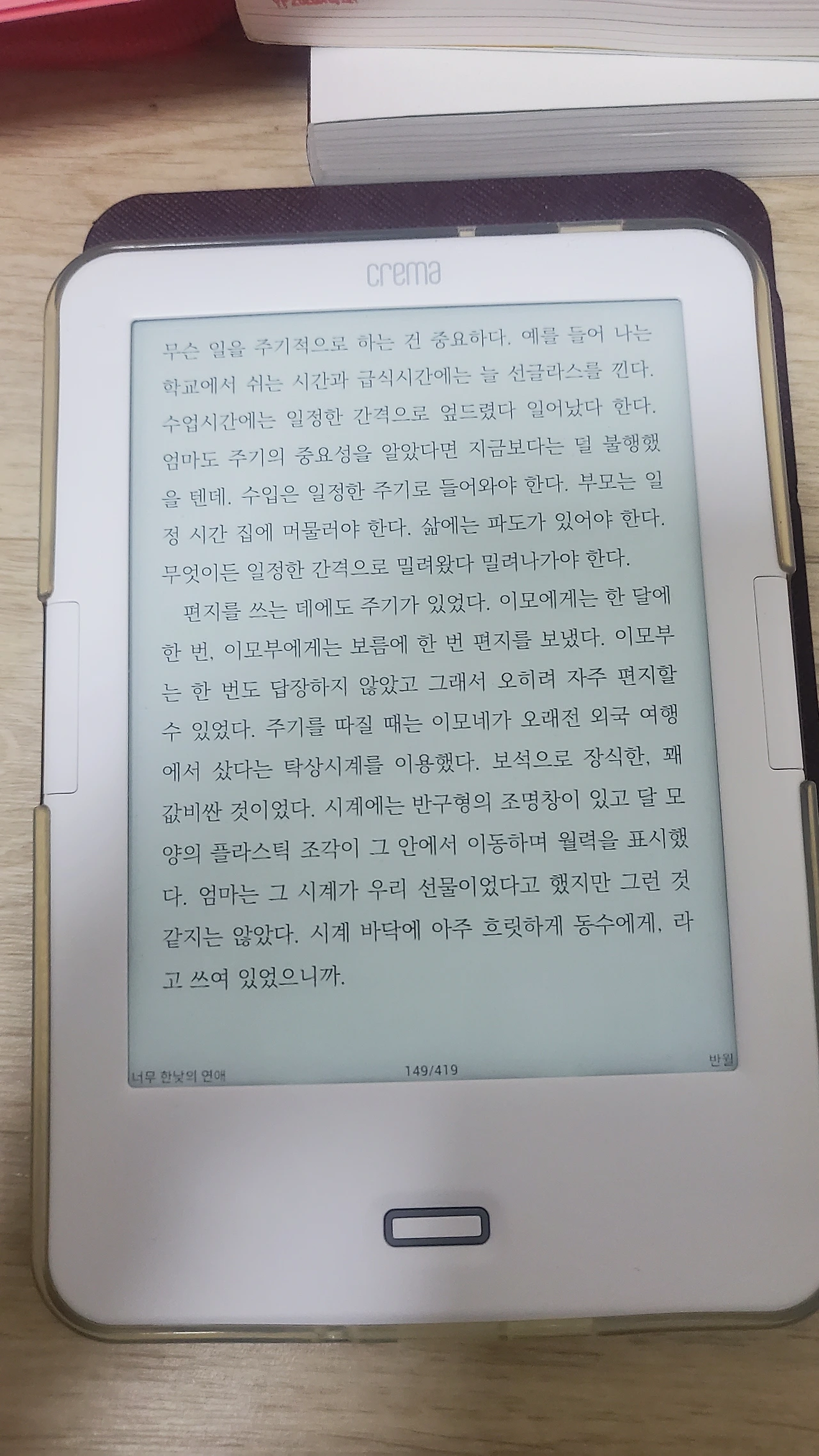 트렌치코트에 서류가방을 든 사람, 그가 무슨 일을 하는지는 모르겠지만 그에게서 풍겨져 나오는 지적인 기운 속에는 손에 든 '이북 리더기'가 있었다. 사고 싶은 게 있으면 지르고야 마는 성격의 나는 단숨에 YES24서점에서 파는 크레마 사운드라는 리더기와 커버를 사고야 말았다. 화면 한 공간에서 다음 페이지로 넘어가는 게 신기하기도 하고, 대기화면도 지정할 수 있어서 처음에는 화면 설정하느라 시간이 다 갔다. 괜히 스마트폰이 하나 더 생긴 것 같기도 해 기분이 좋아졌다.